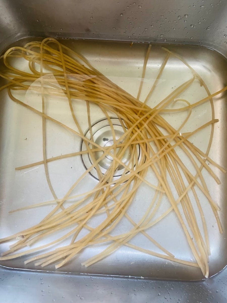 - Assemblaggio e apertura: Mentre i noodles cuociono, prendi una grande ciotola contenente i noodles, prendi qualche cucchiaio di salsa preparata e aggiungi 100 ml di brodo o acqua bollita.