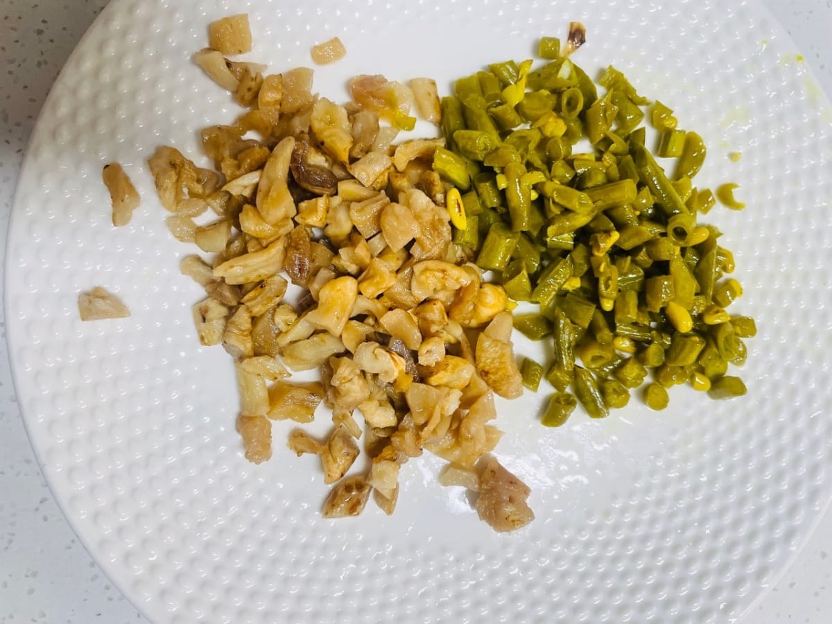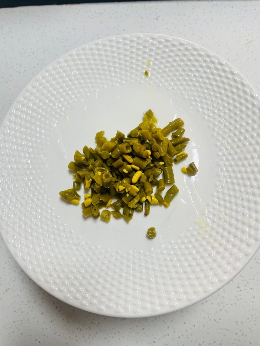 - Preparare i contorni: tagliare a pezzetti i fagiolini sottaceto e il ravanello secco e mettere da parte;