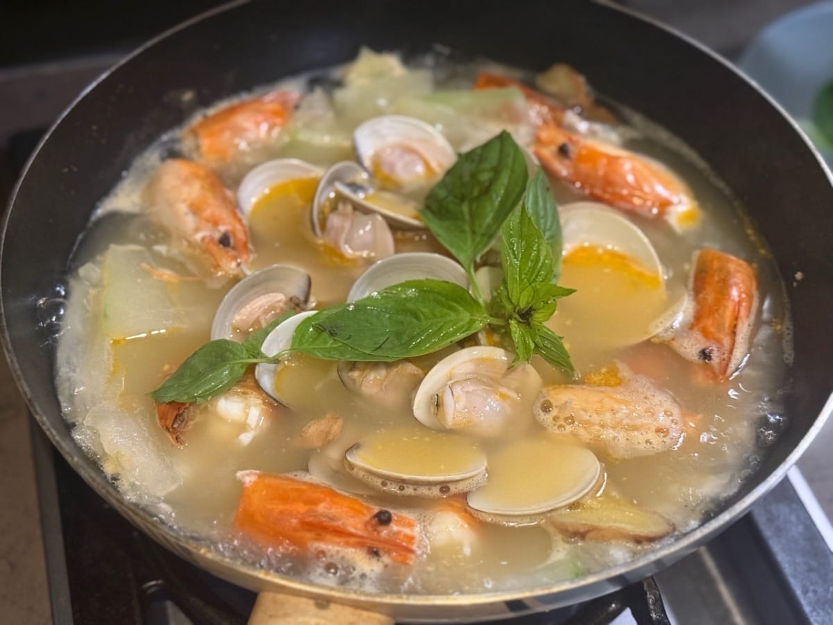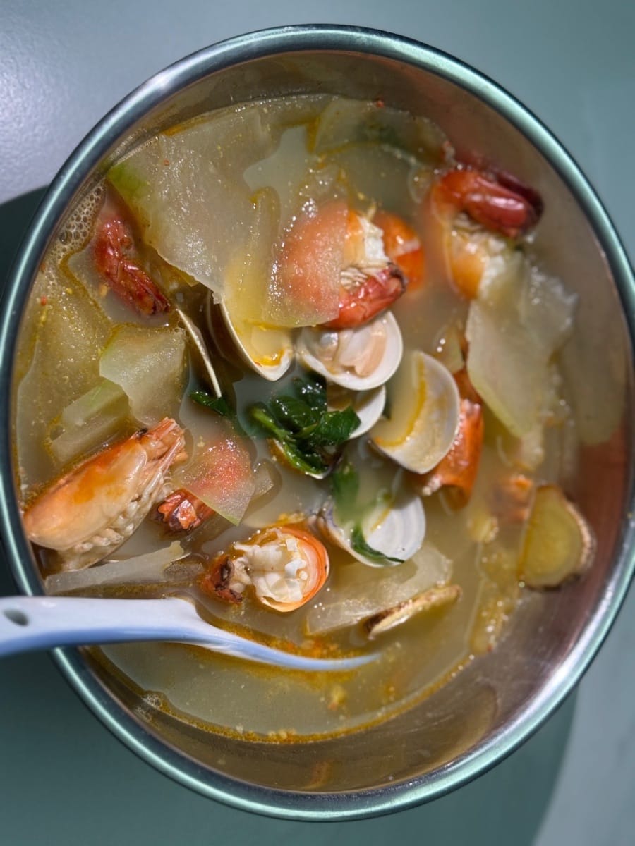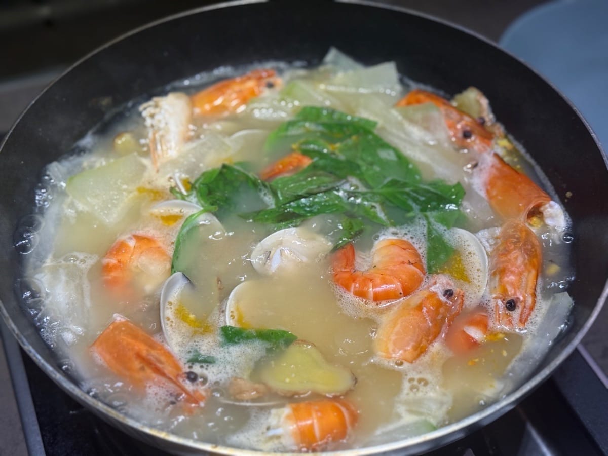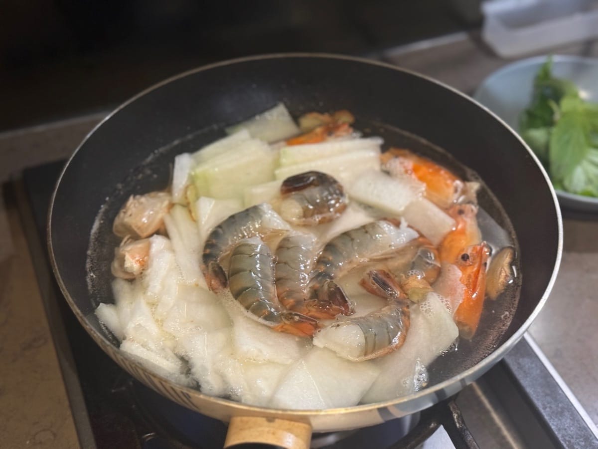 Aggiungere il melone invernale, l'acqua e i gamberetti e cuocere insieme.