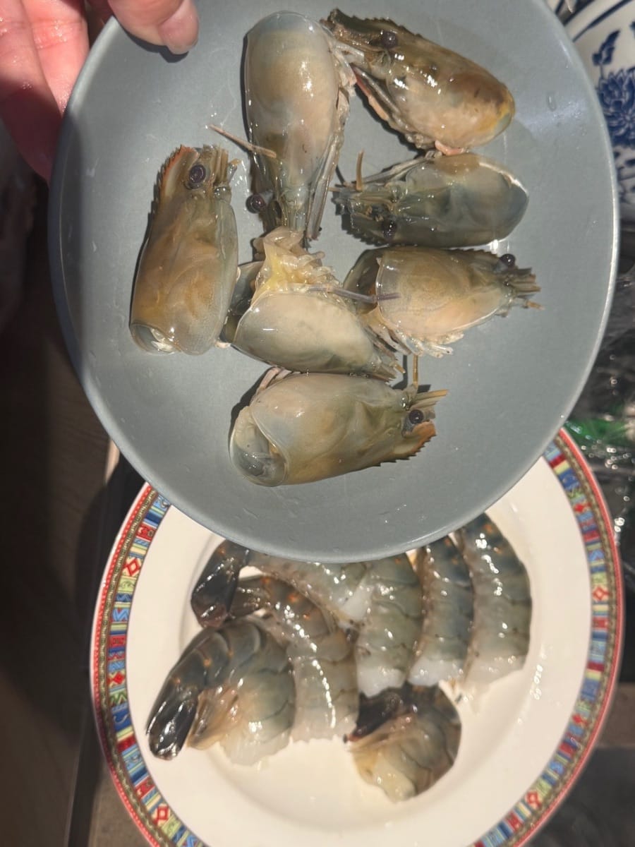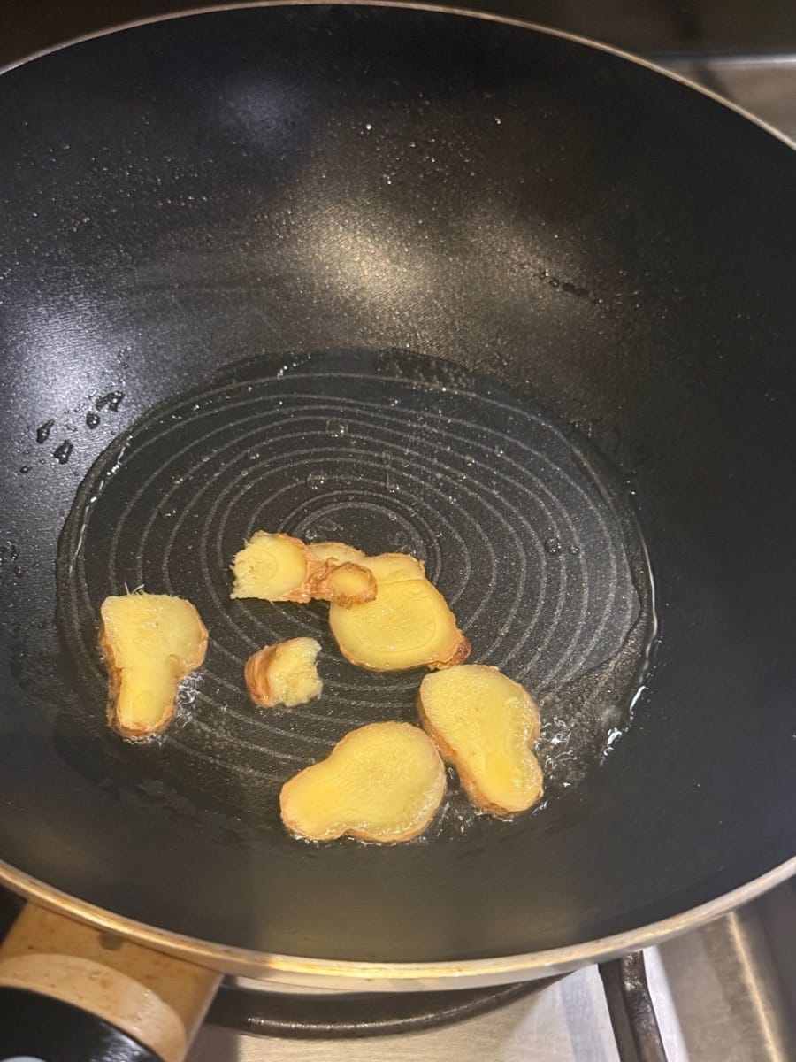 Aggiungere lo zenzero e friggere le teste dei gamberi (estrarre la freschezza).