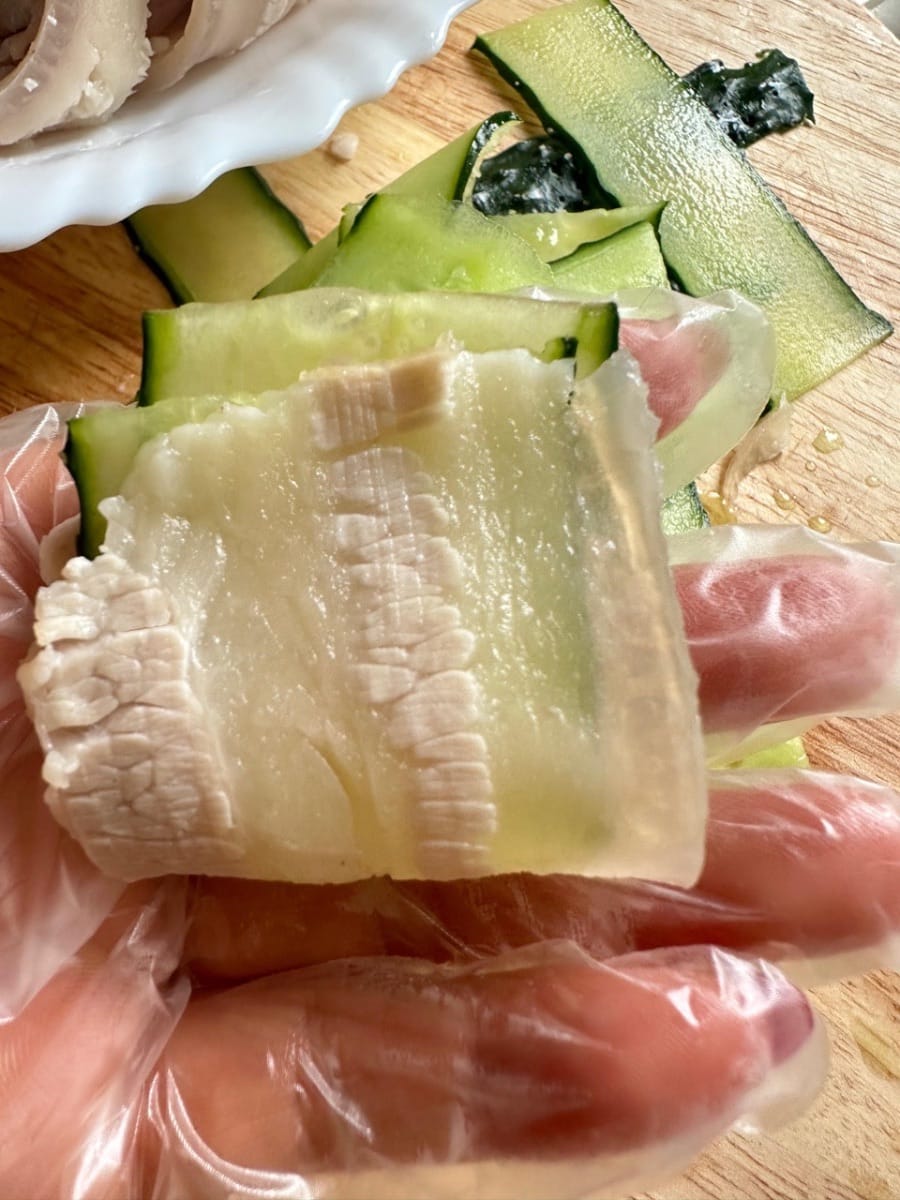 quindi, metti altri cetrioli al centro come base per impilare la parte centrale come mostrato