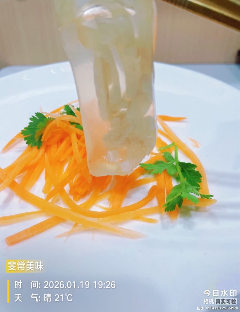 Questo piatto di aspic in stile nord-orientale sprigiona un'aura di star dal momento in cui arriva in tavola! I blocchi traslucidi di aspic sembrano ambra solidificata, tagliati con cura e disposti a forma di fiore, adagiati su un letto di croccanti striscioline di carota e cosparsi di foglie di coriandolo verde brillante: uno spettacolo rinfrescante e festoso. Prendendo un pezzo tremolante, si scopre la consistenza fine della cotenna di maiale all'interno, elastica e vellutata.