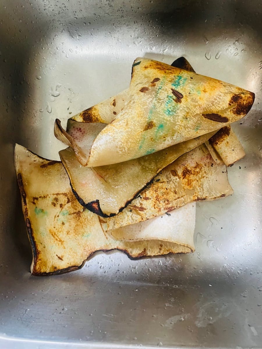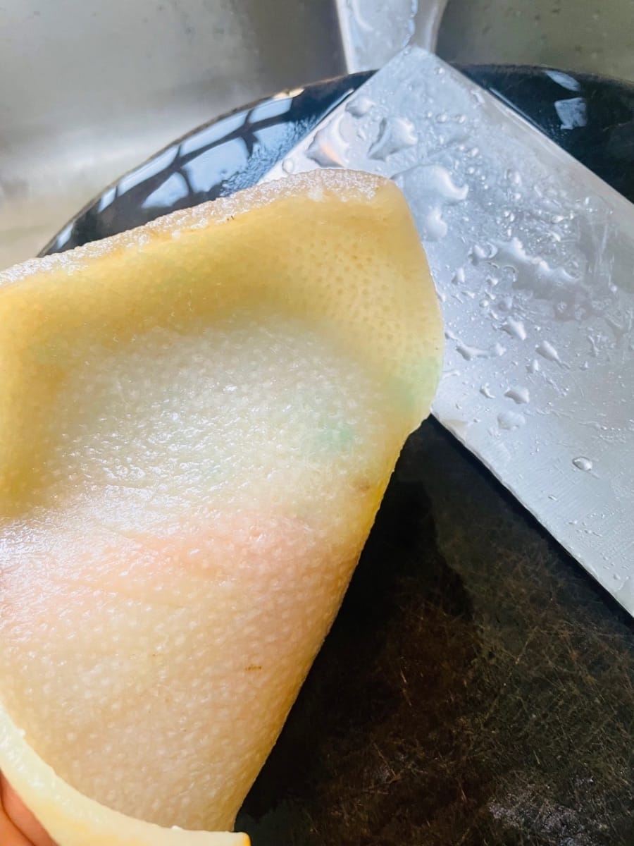 - Toglietelo dal fuoco e sciacquatelo con acqua tiepida. Il segreto è raschiare via tutto il grasso all'interno della cotenna di maiale! Non potete saltare questo passaggio, altrimenti l'aspic finito sarà unto con tre strati di olio.