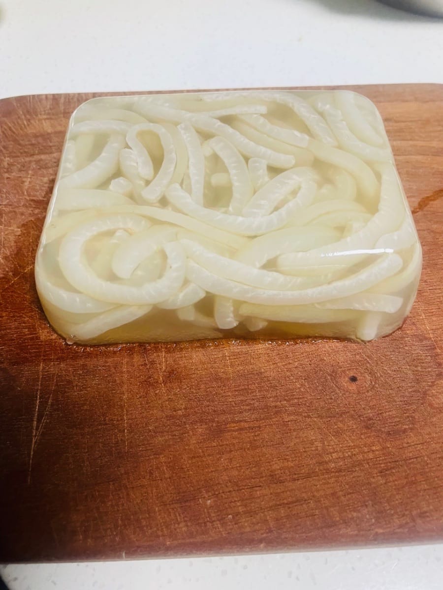 - Versate la cotenna di maiale cotta e il brodo in uno stampo, lasciate raffreddare a temperatura ambiente per un po', poi mettete in frigorifero a rassodare. Ora potete andare a guardare i vostri programmi preferiti; una volta rassodata, diventerà naturalmente elastica e gommosa.