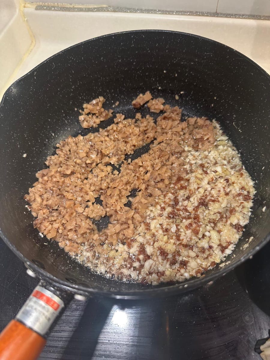 - Quindi tritare anche i funghi shiitake e continuare a soffriggere