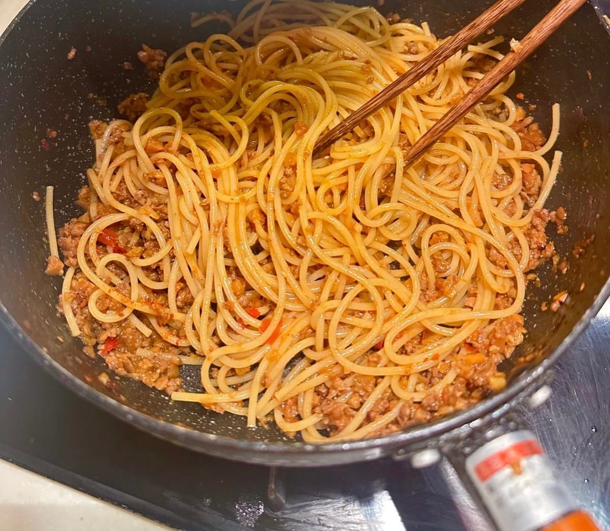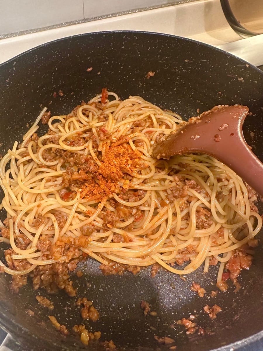 Spaghetti con carne macinata e panna piccante