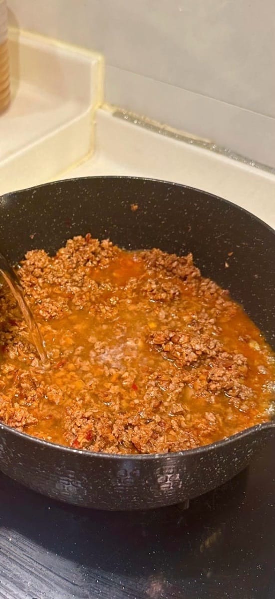 - Buttare la pasta in una pentola con il sugo di manzo piccante e mescolare