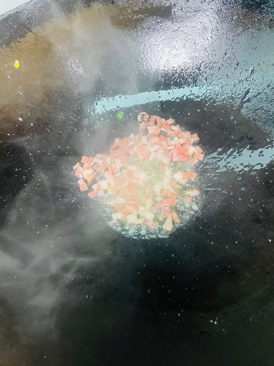 - Aggiungere un altro cucchiaio d'olio, soffriggere la pancetta finché il grasso non si sarà sciolto, quindi aggiungere le cipolle tritate e soffriggere finché non saranno fragranti. Infine, aggiungere il kimchi e soffriggere a fuoco vivo per far sprigionare completamente il sapore aspro e piccante.