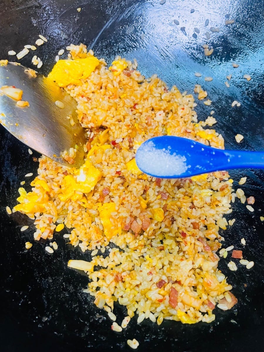 - Versare il riso freddo e saltare velocemente fino a quando ogni chicco di riso non sarà ricoperto dal colore del kimchi e diventerà lucido e traslucido. Quindi aggiungere le uova strapazzate e saltare uniformemente con il riso.
