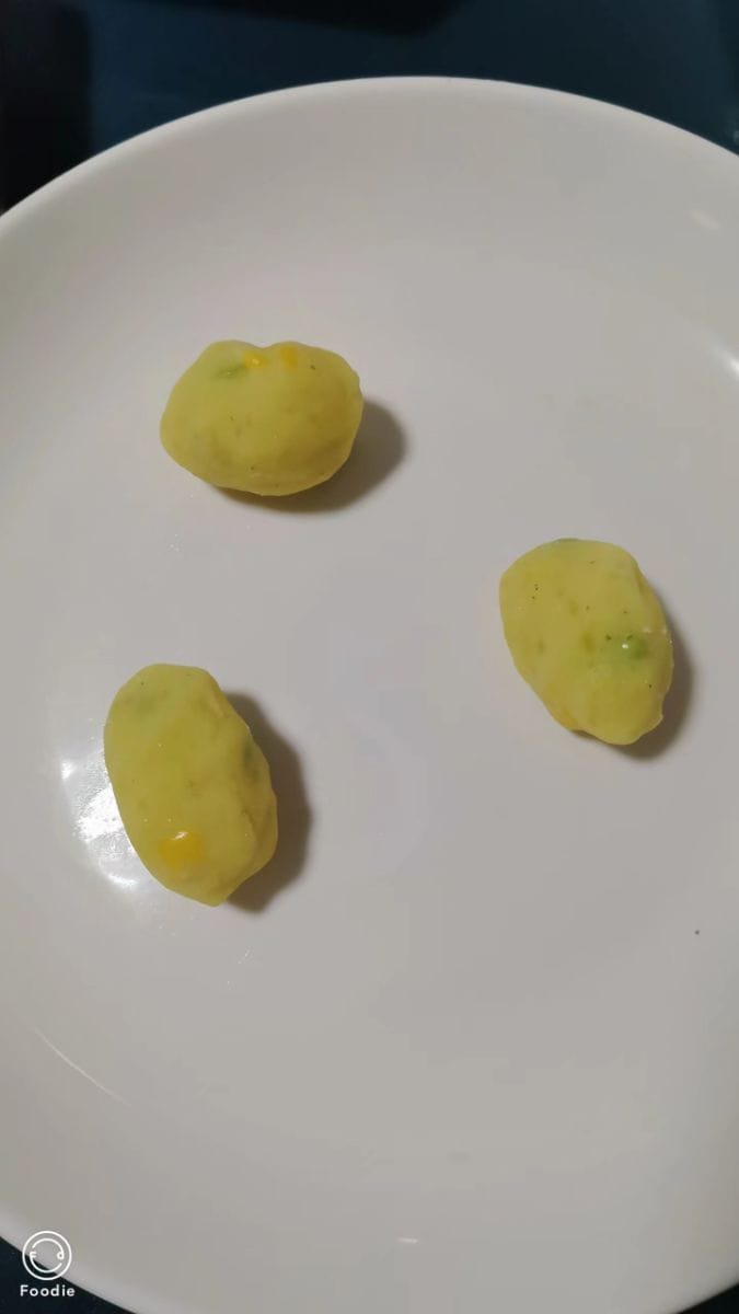 - Schiacciare le patate al vapore con una forchetta, aggiungere i chicchi di mais e i piselli, un pizzico di sale e pepe e mescolare bene.
