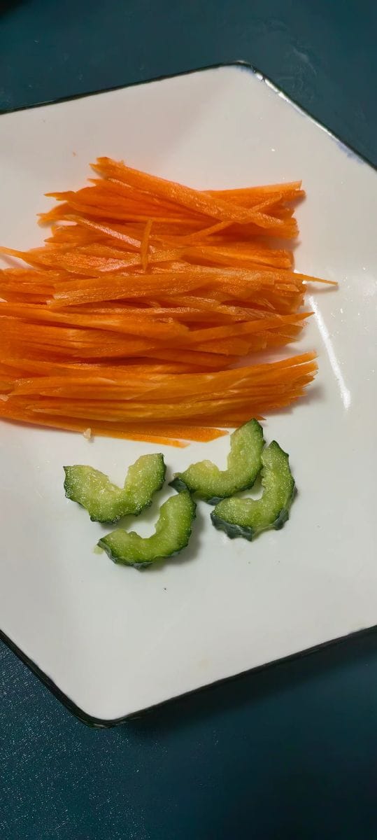 - Tritare le carote, sbollentarle brevemente in acqua bollente e metterle da parte. Il cetriolo non ha bisogno di essere sbollentato.