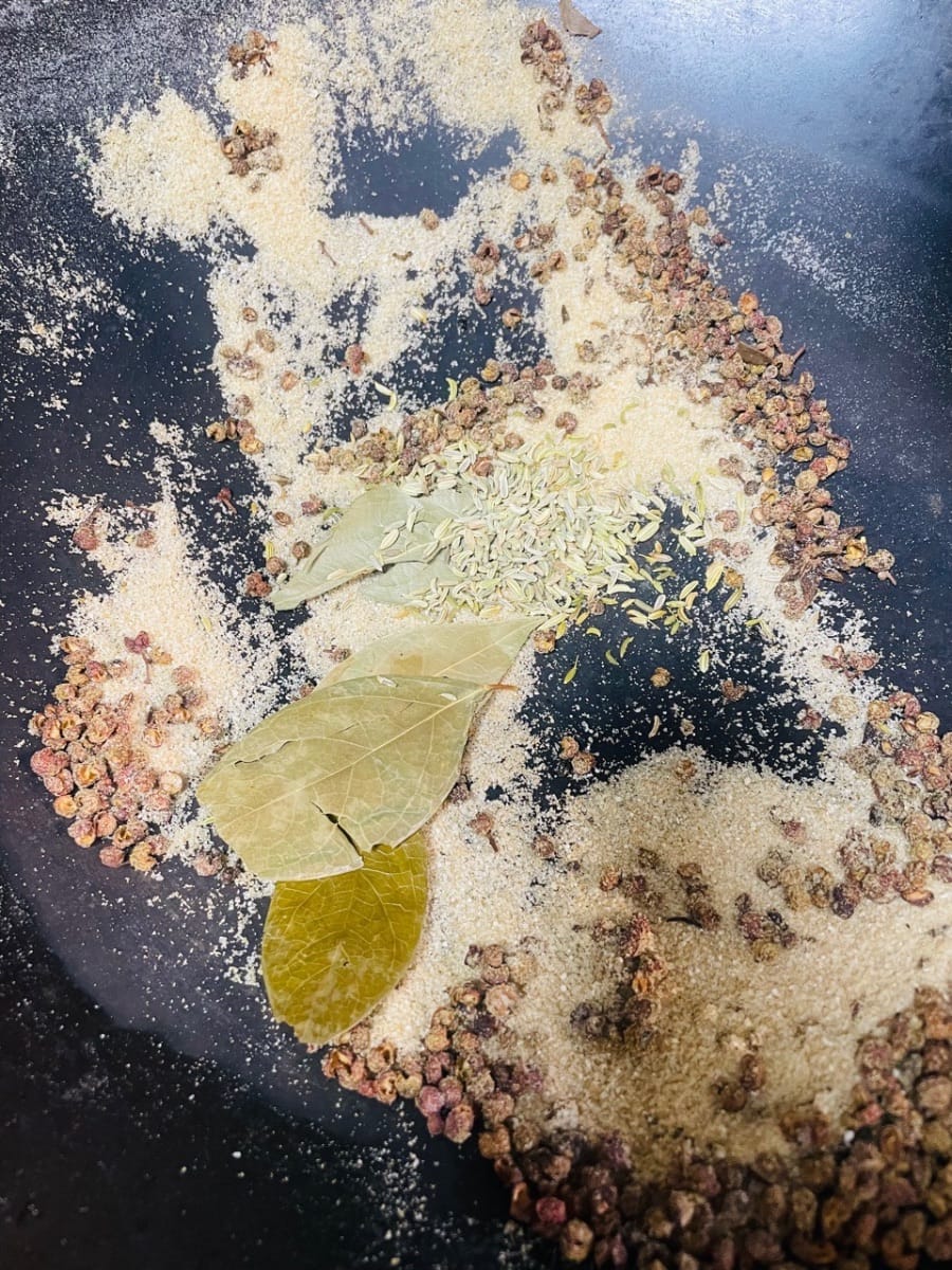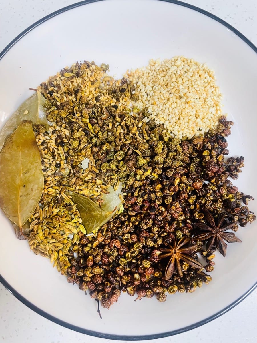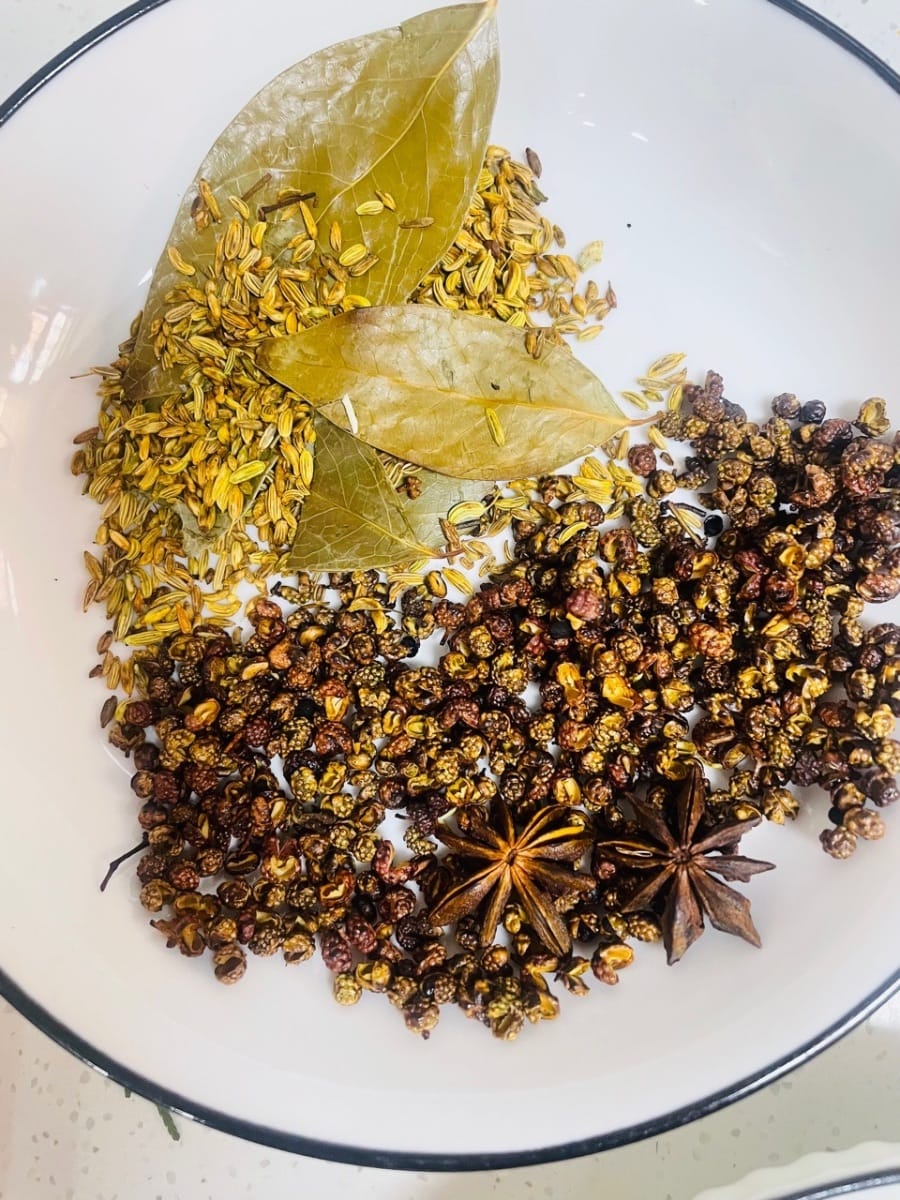 - Per prima cosa, lavate le spezie come il pepe di Sichuan, l'anice stellato, i semi di finocchio e le foglie di alloro e scolatele. Scaldate la pentola a fuoco basso, aggiungete il pepe di Sichuan e l'anice stellato e fate soffriggere fino a quando non saranno asciutti e profumati. Togliete dalla pentola e lasciate raffreddare.