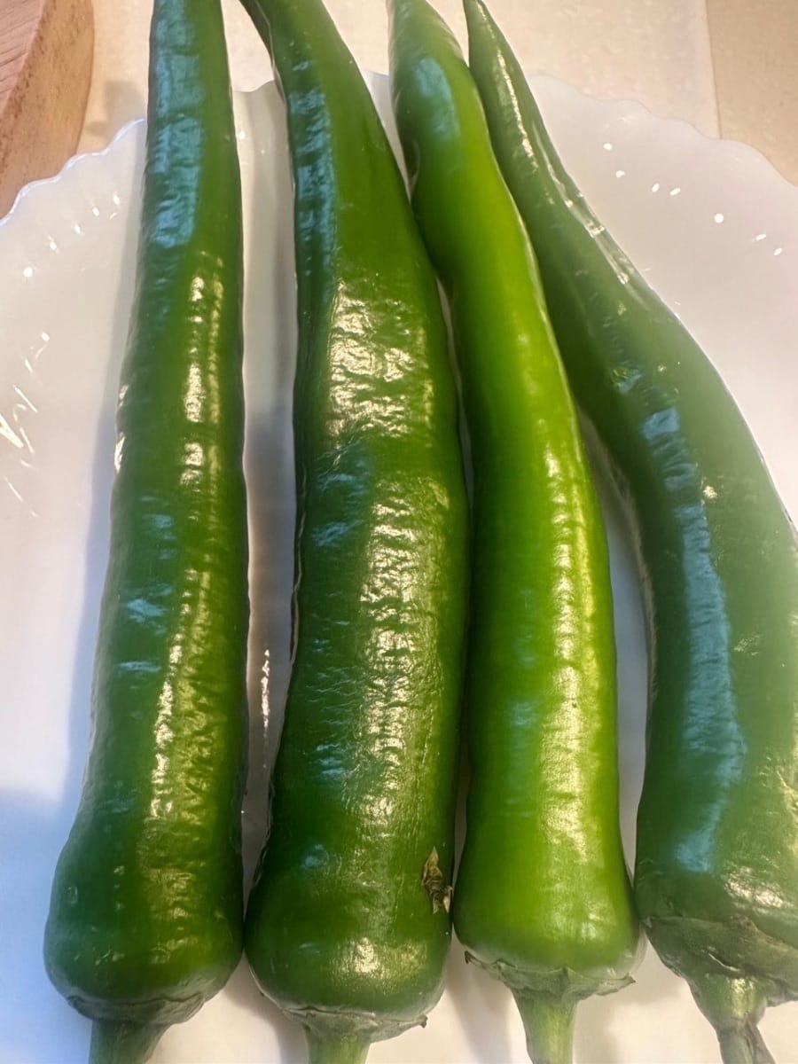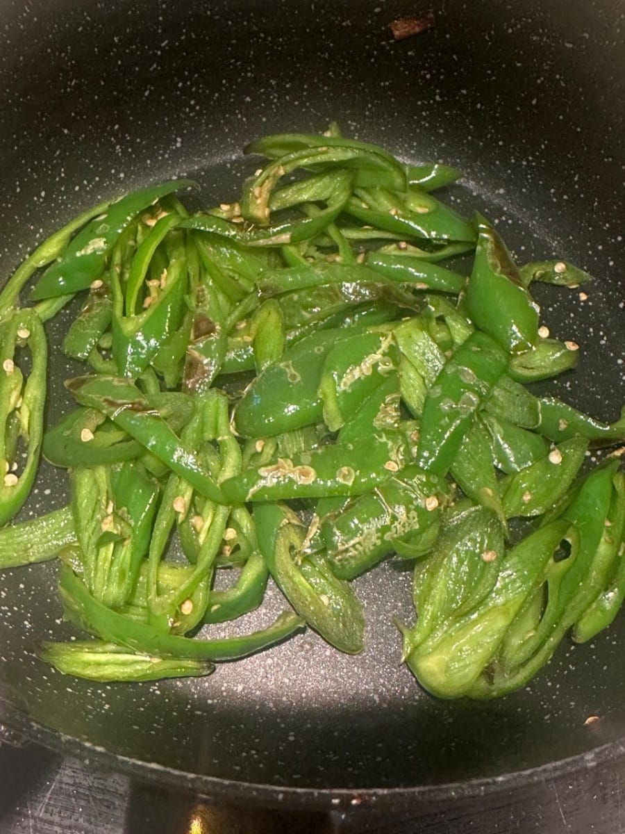 - in una padella SENZA olio, aggiungere i peperoncini verdi e anche un po' di sale che aiuta i peperoncini ad ammorbidirsi