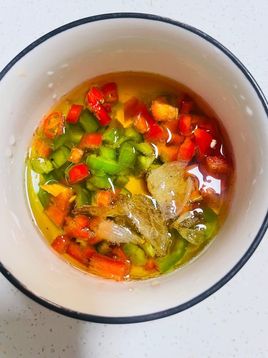 - Olio al peperoncino piccante: tritate finemente i peperoncini verdi e rossi e metteteli in una ciotola. Versate l'olio di sesamo appena fatto e bollente. Con un leggero sfrigolio, l'aroma riempirà all'istante tutta la cucina! Questo olio al peperoncino è umido, profumato e piccante, un abbinamento perfetto per l'olio al peperoncino che seguirà. Aggiungetene un cucchiaio mentre mescolate i noodles e sarà così delizioso che vorrete leccare la ciotola per pulirla!