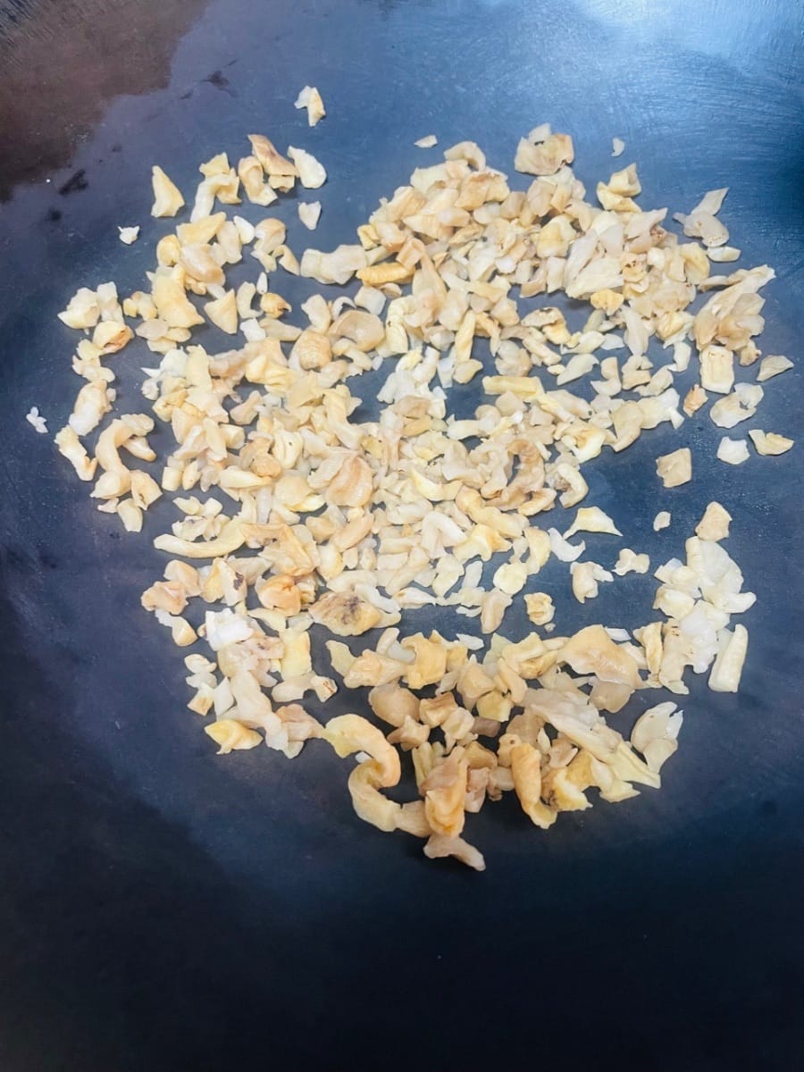 - Preparare le verdure: tritare carote, cipollotti, cipolle, zenzero e aglio e mettere da parte. Asciugare con carta assorbente.
