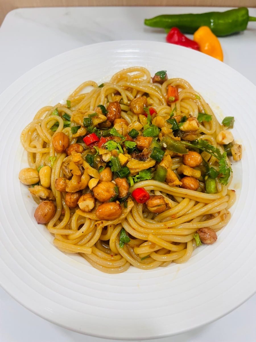 - Mettete i noodles di riso in un contenitore capiente. Aggiungete prima 1 cucchiaio di olio al peperoncino e 2 cucchiai di salsa di soia. Quindi, prelevate un cucchiaio di olio piccante ottenuto versando a filo olio di sesamo caldo e peperoncini verdi e rossi tritati. Mescolate bene. Ogni noodles di riso è ricoperto dalla salsa oleosa, l'aroma è così invitante che farà bussare alla porta i vicini! Aggiungete il ravanello essiccato saltato in padella e le arachidi fritte, e infine cospargete con coriandolo e cipollotti tritati. Mescolate bene ed è pronto da mangiare! L'aroma è così forte che vi lascerà a bocca aperta; ogni boccone è autentico sapore di Nanchang!