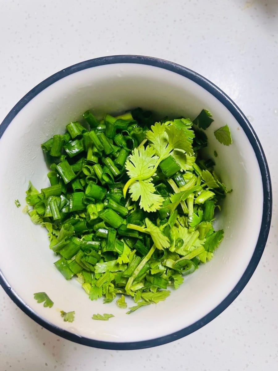 - Preparazione del coriandolo: Lavare il coriandolo e le foglie bianche del cipollotto, asciugarli con carta da cucina e metterli da parte per un utilizzo successivo.