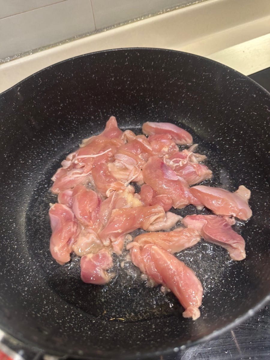 油を熱したフライパンに鶏肉を入れ、マリネ液に漬け込んだものを表面の色が変わるまで焼きます。フライパンから取り出し、