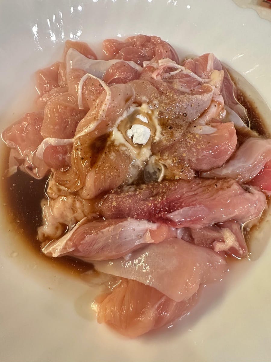 次に、鶏肉を記載されている材料でマリネし、脇に置いておきます