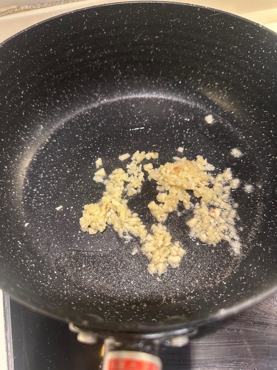 同じフライパンに油を追加し、みじん切りにしたニンニクを香りが立つまで炒めます。
