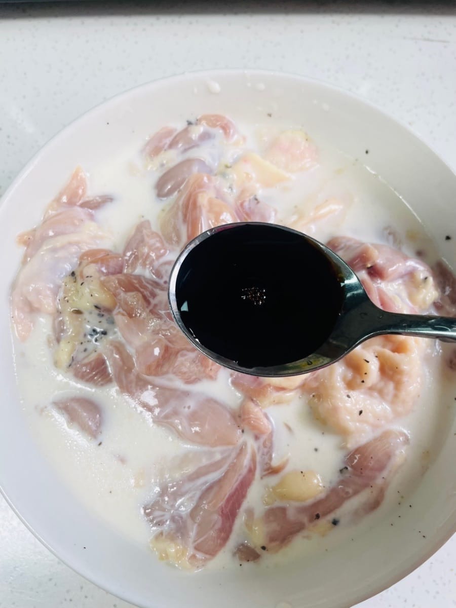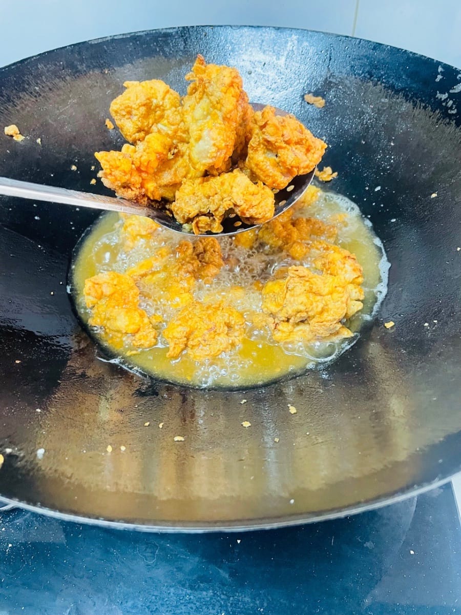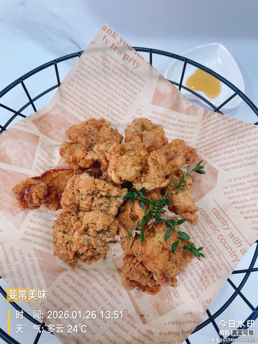 この韓国風フライドチキンは、見た目も絶品!黄金色に揚げられた皮は、ハニーマスタードソースでキラキラと輝き、パセリが散らばっています。見た目も華やかで、食欲をそそります。一口食べれば、パリッとした皮が口の中でとろけ、中は柔らかくジューシーな鶏肉の旨味が溢れ出します。黒胡椒の香りと甘辛いソースが絶妙に調和し、指を舐めてしまうほどの美味しさです。一気見や友人との集まり、夜食にもぴったりで、ビールとの相性も抜群です。韓国ドラマで味わったあの喜びを、自宅で再現すれば、きっと止まらなくなるはずです!
