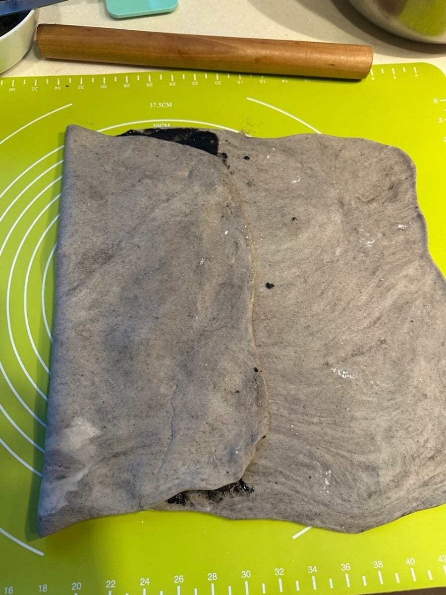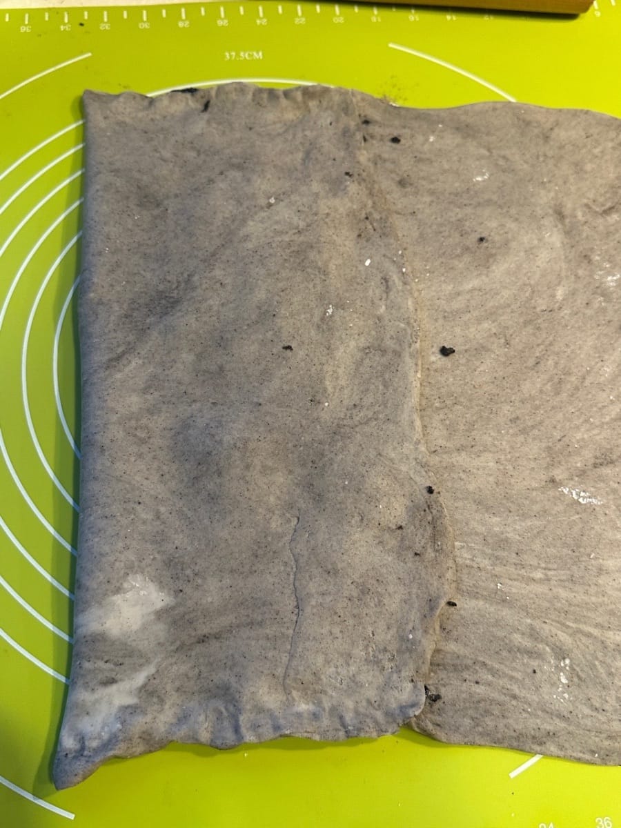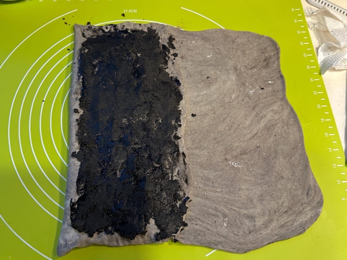 반죽의 가운데 1/3 부분에 검은깨 소를 고르게 펴 바릅니다.