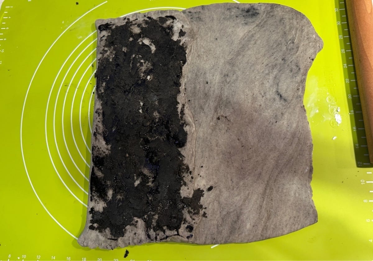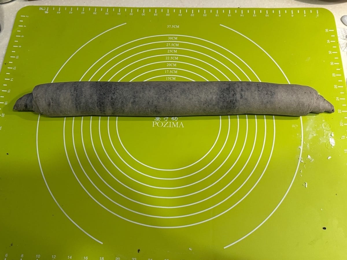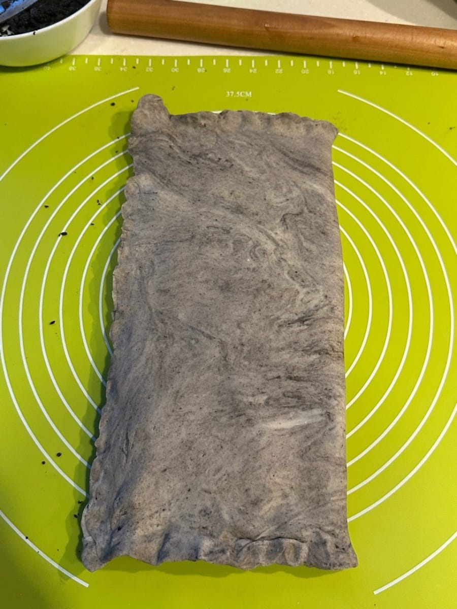 반죽의 가운데 1/3 부분에 검은깨 소를 고르게 펴 바릅니다.