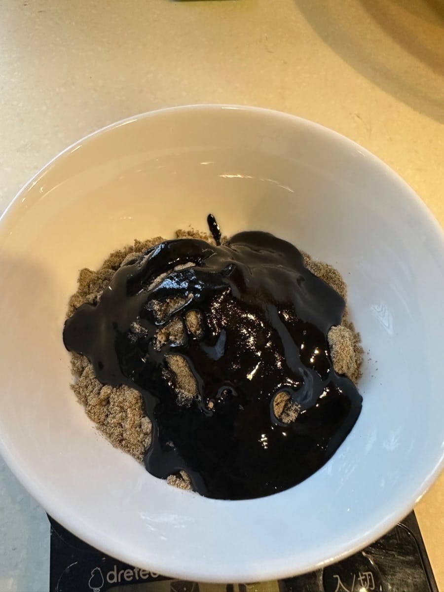 기다리는 동안 필요한 재료들을 섞어 속을 준비하세요. 약간 끈적거리거나 버터 같은 질감이 될 것입니다.