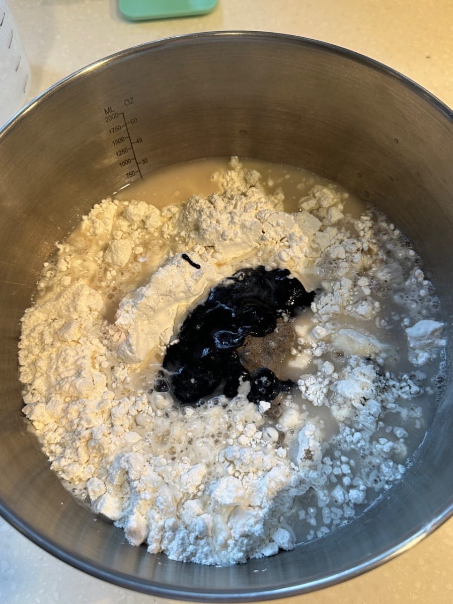 깨끗한 믹싱 볼에 먼저 모든 건조 재료를 넣고, 그 다음 물과 효모 혼합물을 넣으세요.