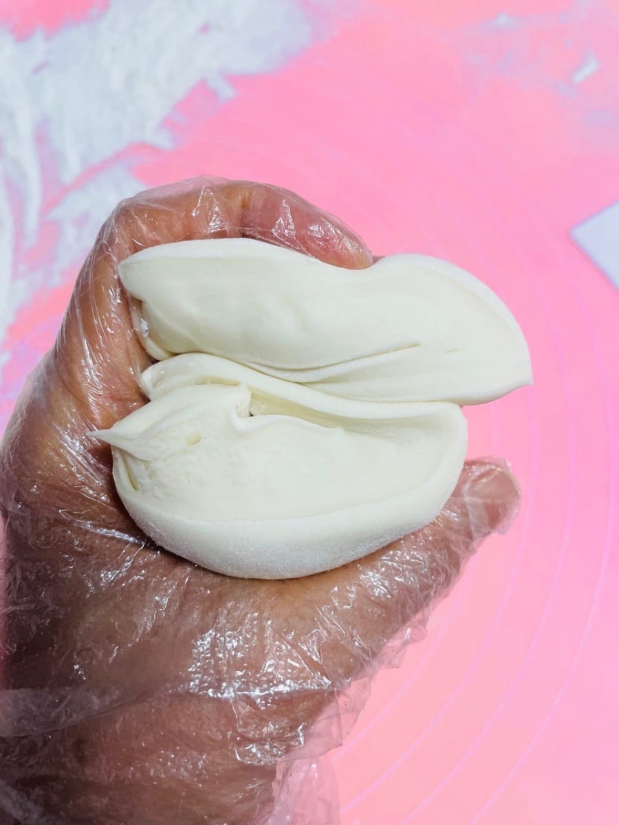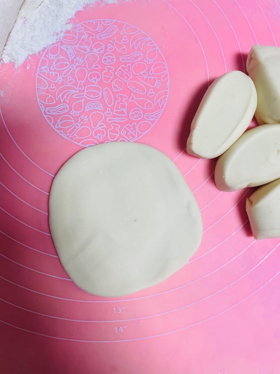 - 반죽을 둥글게 밀어 펴는데, 가운데는 두껍게, 가장자리는 얇게 만듭니다. 밀면서 돌려가며 밀어주면 두께가 고르지 않게 되거나 소가 새어 나오는 것을 방지할 수 있습니다. 팥소를 넣고 가장자리를 잘 봉하여 둥근 모양으로 만듭니다.
