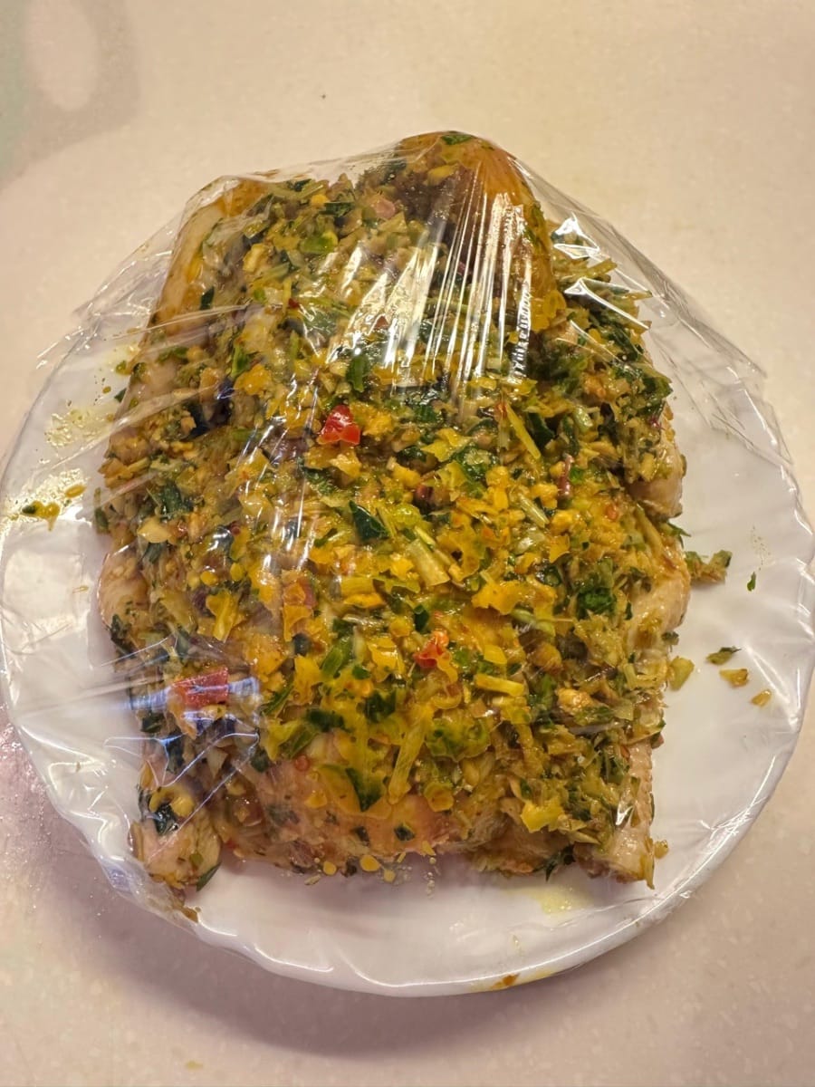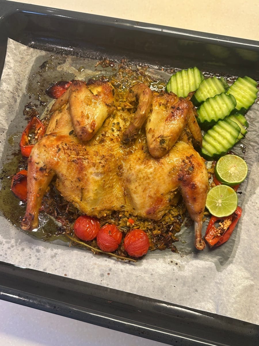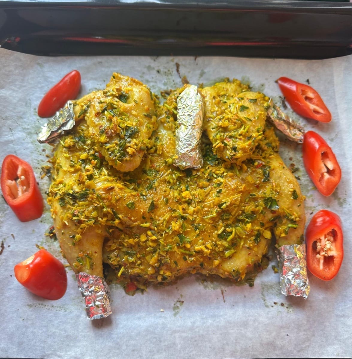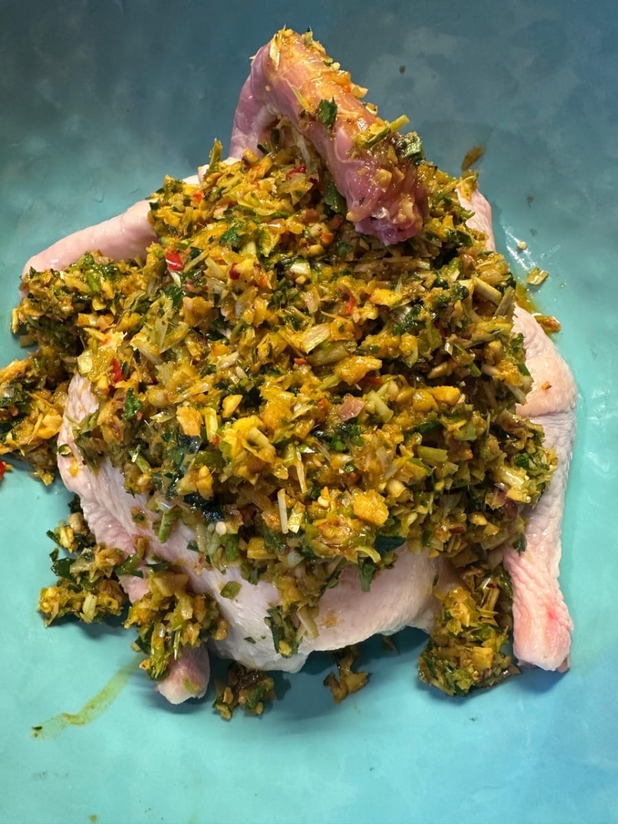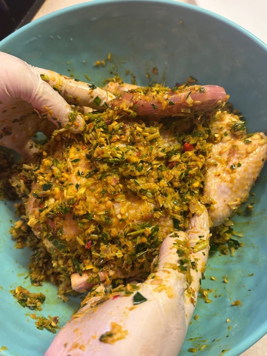 향긋한 태국식 닭고기 요리로, 고수 뿌리, 마늘, 레몬 잎, 샬롯, 레몬그라스, 태국 생강, 그리고 약간의 붉은 고추로 만든 향긋한 양념에 재워 만듭니다. 강황은 따뜻한 황금빛 풍미를 더하고, 흑설탕과 피시소스는 단맛과 짠맛의 균형을 이루어 태국 요리 특유의 깊은 맛을 선사합니다. 마지막으로 녹인 버터를 발라 윤기를 더합니다.