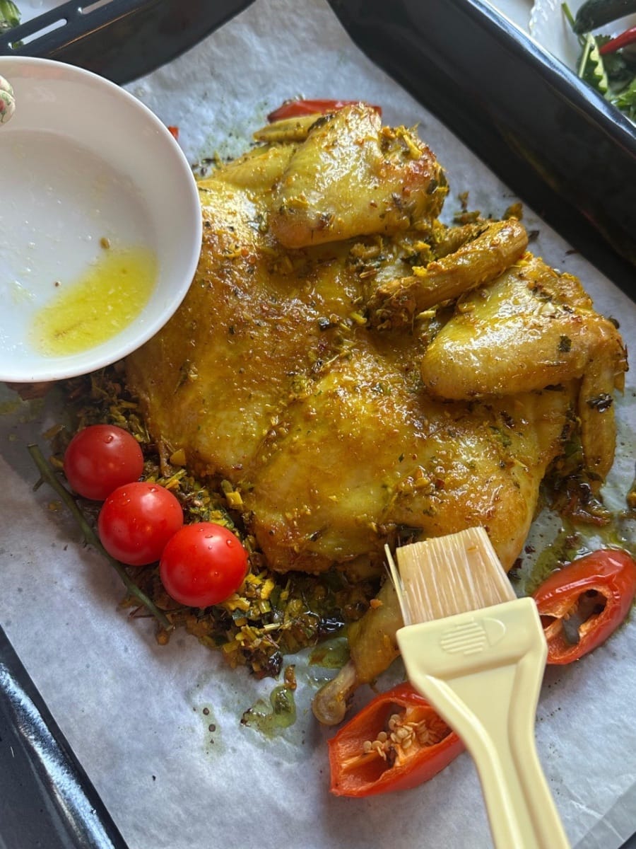 - 오븐에서 꺼낸 후 닭고기에 녹인 버터를 얇게 발라 윤기를 더해 주세요.