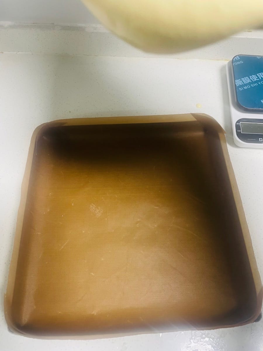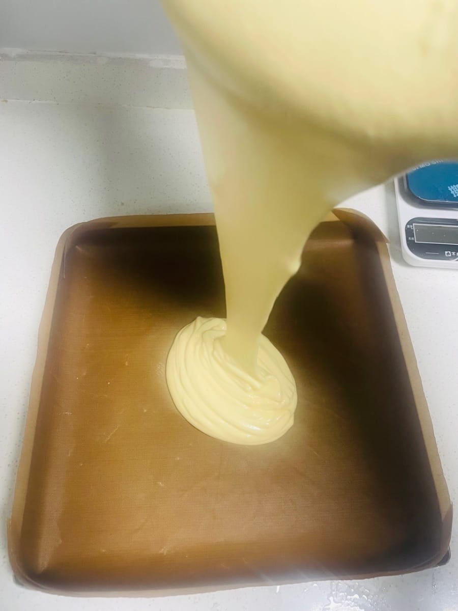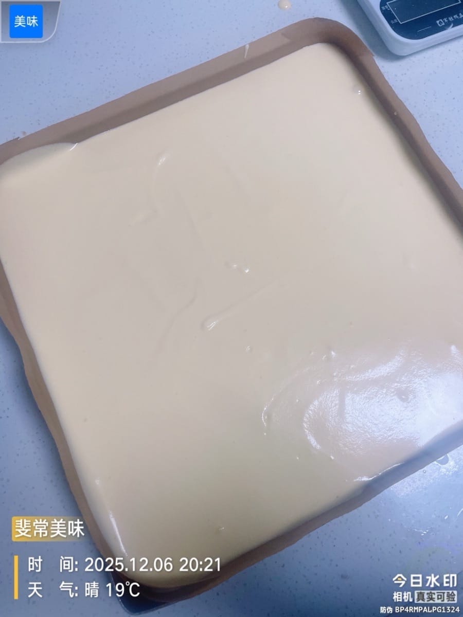- 케이크 크러스트 굽기. 반죽을 28×28×3cm 베이킹 팬에 붓고 골고루 펴준 후, 케이크 크러스트 표면이 매끈해지도록 몇 번 가볍게 두드려줍니다. (큰 기포를 제거하여 케이크 크러스트 표면을 매끄럽게 합니다.) 오븐 중간 선반에 넣고 150°C(300°F)에서 20분간 굽습니다. 12분 후에는 알루미늄 호일로 덮어줍니다. (표면이 타는 것을 방지하기 위함입니다.)
