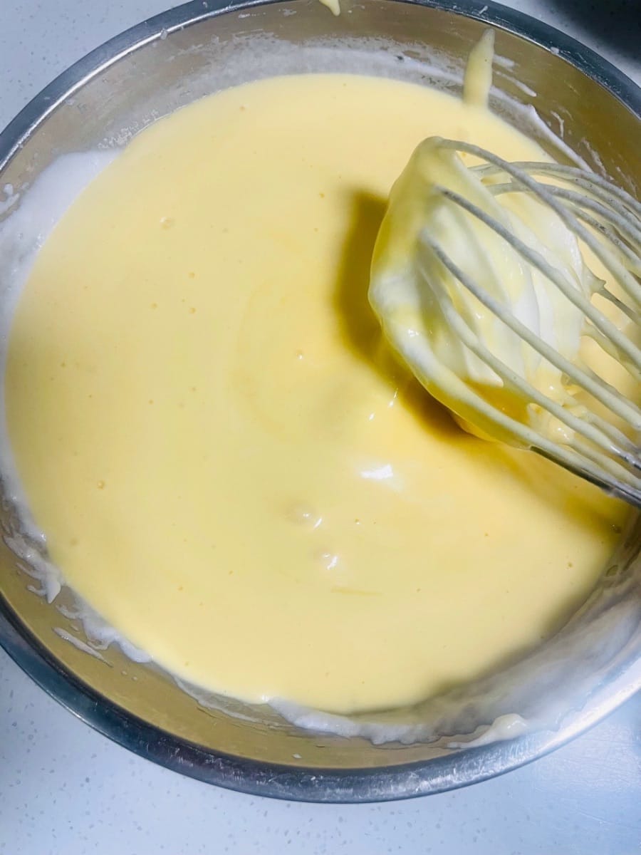 - 반죽에 밀가루를 넣습니다. 케이크 가루를 붓고 "Z" 모양으로 섞습니다. 원을 그리며 섞지 마세요. (원을 그리며 섞으면 밀가루에서 글루텐이 생성되어 케이크가 덜 부드러워집니다.)
