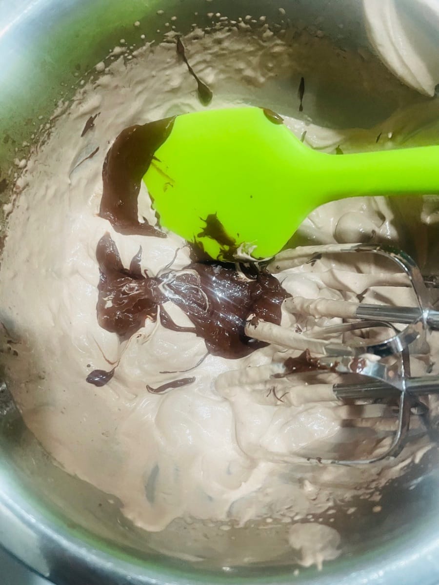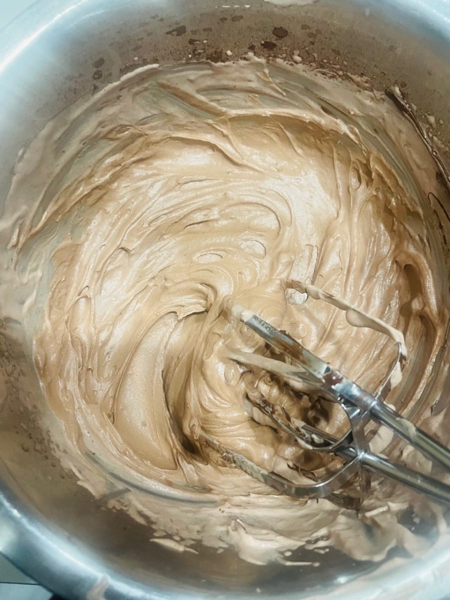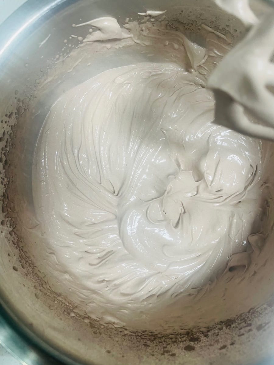 생크림 휘핑 준비: 실온은 20°C 이하가 좋습니다. 더우면 에어컨을 켜고 볼 아래에 얼음팩을 깔아주세요. (온도가 너무 높으면 크림이 녹아 굳기 어렵습니다.) 생크림 200g에 코코아 파우더 5g과 설탕 19g을 넣고 "흐르지만 주름이 얕은" 정도의 농도가 될 때까지 휘핑합니다. (70% 휘핑: 너무 뻑뻑하게 휘핑하지 마세요. 휘핑하기 어렵습니다.)