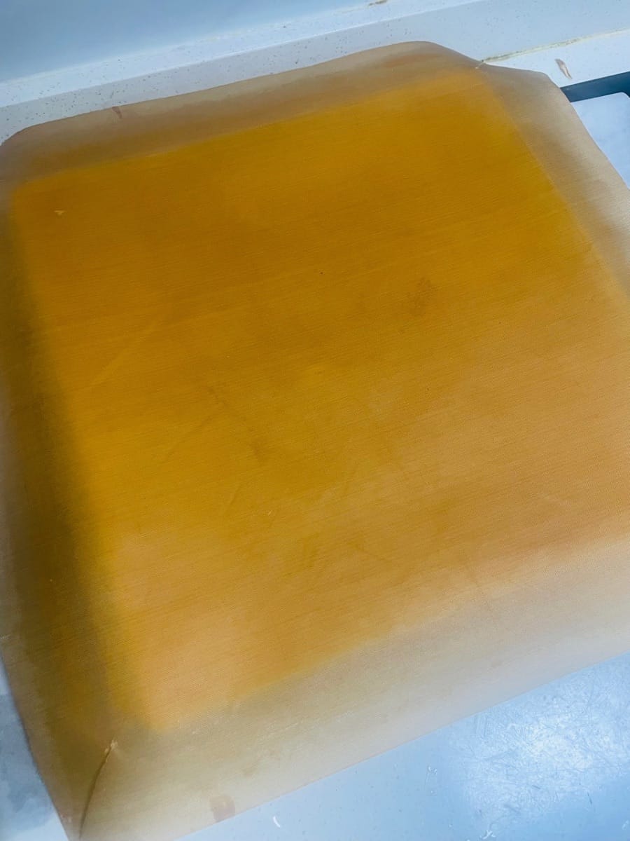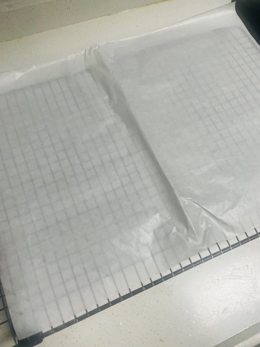 - 케이크 크러스트 식히기. 굽고 나면 케이크 크러스트를 식힘망에 뒤집어 놓습니다. 먼저 바닥의 유산지를 벗겨낸 후 새 유산지로 덮습니다. (케이크 크러스트를 뒤집어 유산지로 덮으면 케이크 크러스트가 마르고 갈라지는 것을 방지할 수 있습니다. 자연 식혀야 합니다.)