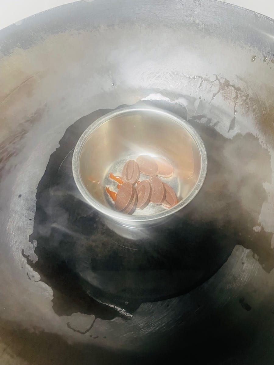 - 초콜릿 녹이기. 초콜릿 코인 30g을 그릇에 담고 중탕으로 녹입니다. (나중에 장식용으로 크림과 섞어 사용합니다.)