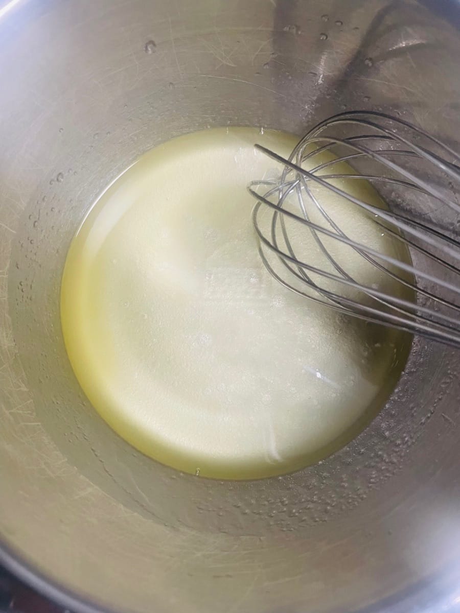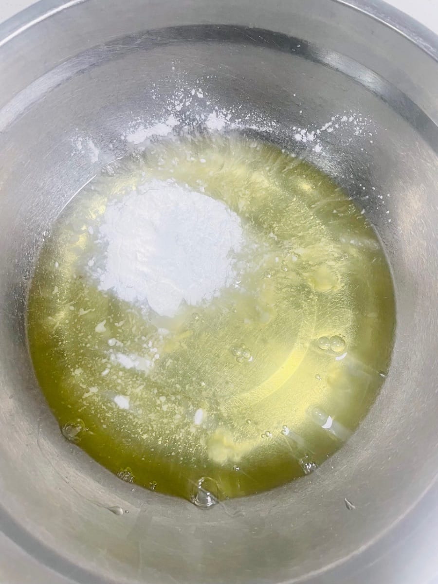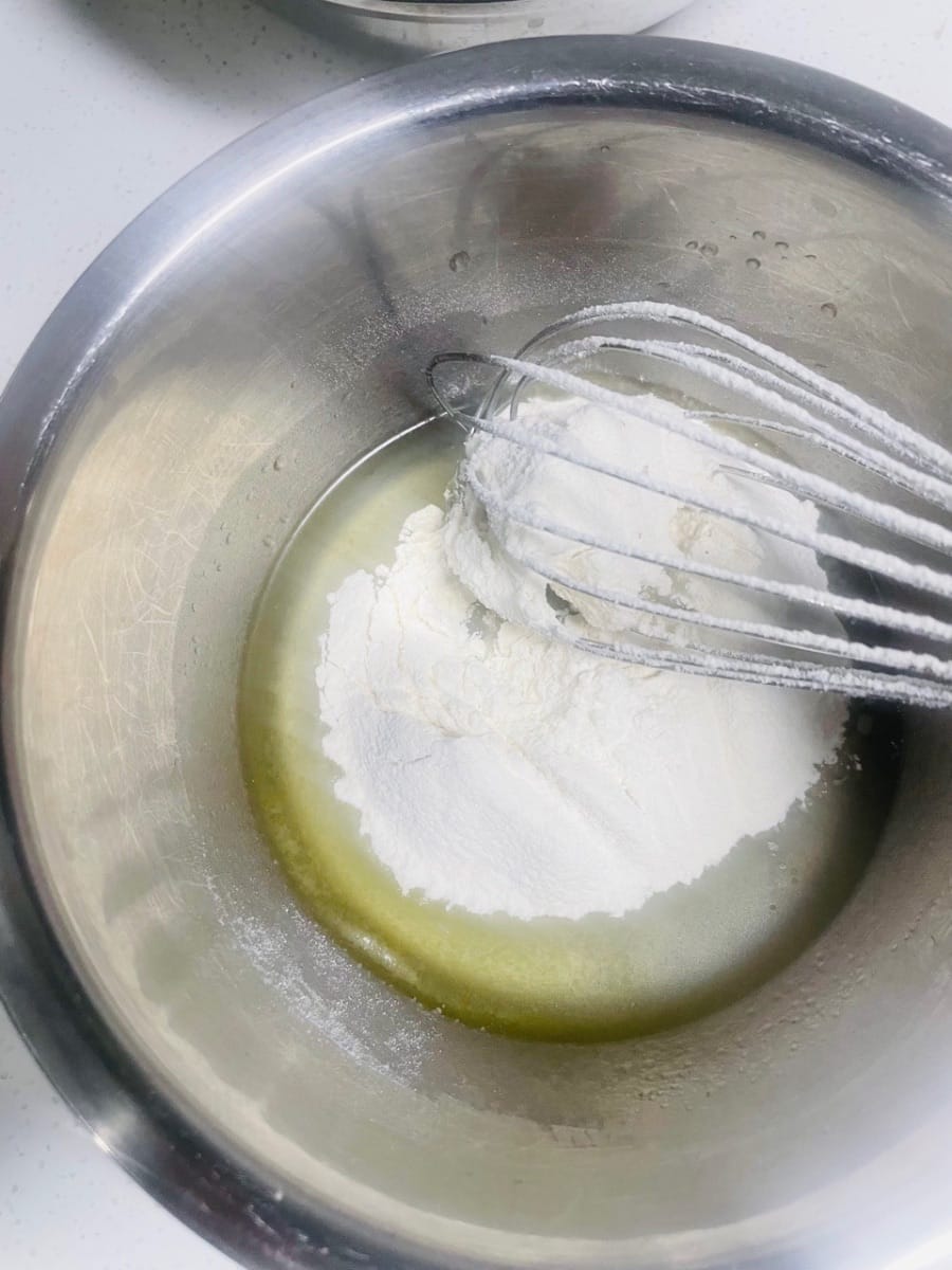 - 반죽 베이스를 준비합니다. 한 그릇에 물/우유 50g, 옥수수유 50g, 백설탕 20g을 넣고 잘 저어줍니다. (액상 재료를 먼저 섞으면 반죽이 더 부드러워집니다.)