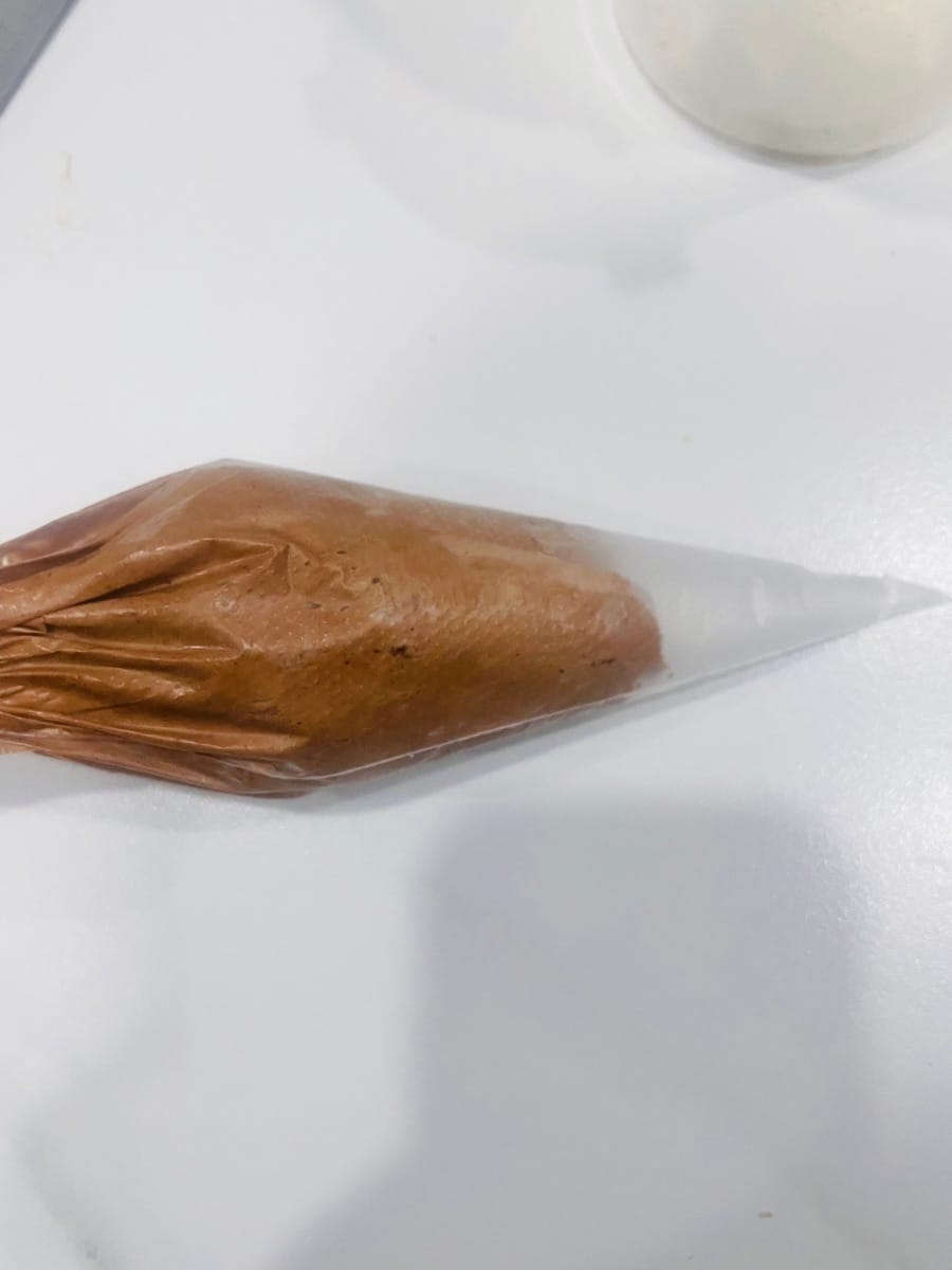 - 가나슈 크림을 따로 준비합니다. 남은 크림을 녹인 초콜릿에 넣고 잘 섞은 후, 짤주머니에 담습니다.