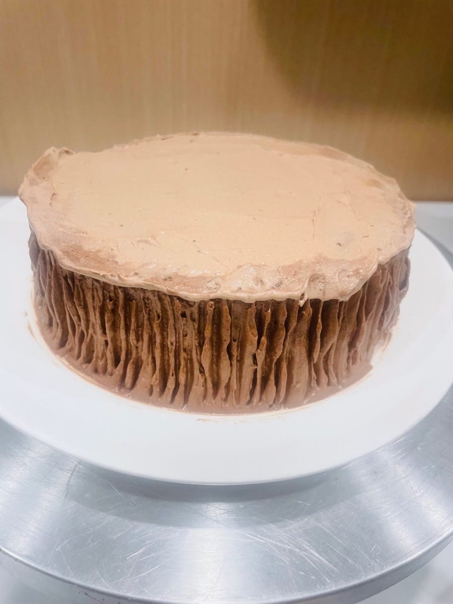 케이크에 초콜릿 버터크림을 바르고 포크나 숟가락을 사용하여 세로로 몇 줄을 긋습니다(너무 매끄럽게 하지 마세요. 질감이 좀 더 있으면 "수제" 느낌이 납니다). 마지막으로, 창의력을 발휘하여 원하는 대로 장식해 보세요. 저는 딸기를 몇 개 얹고, 버터크림을 짜 넣었고, 이쑤시개를 사용하여 작은 눈사람 눈에 초콜릿을 콕콕 찍어주기도 했습니다!