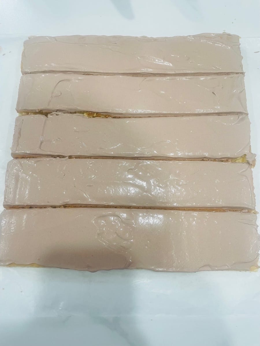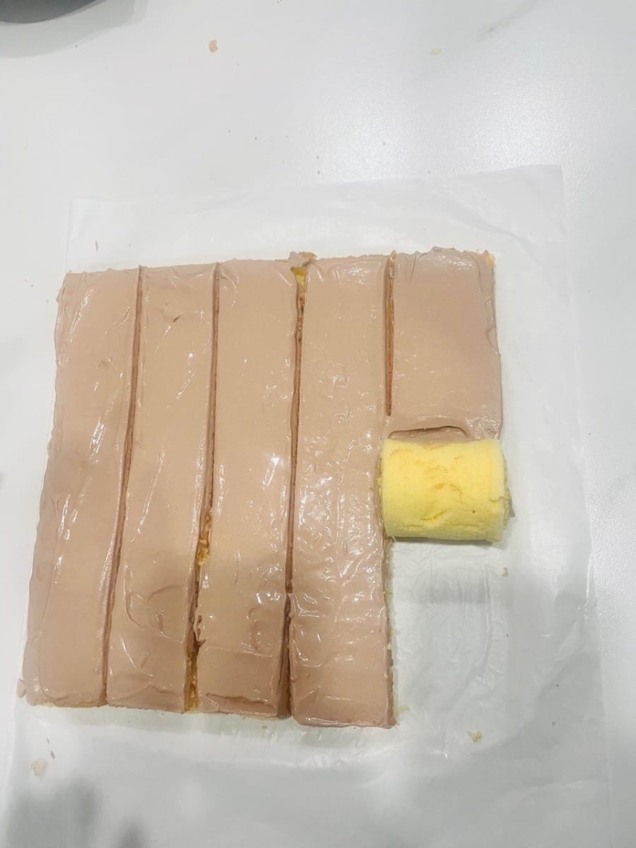 - 케이크 크러스트 다듬기. 식힌 케이크 크러스트를 앞면이 위로 오도록 놓고 네 모서리를 각각 1cm씩 다듬습니다. (깔끔하게 다듬으면 밀기가 수월하고, 모서리가 불규칙하면 질감이 더 딱딱해집니다.)
