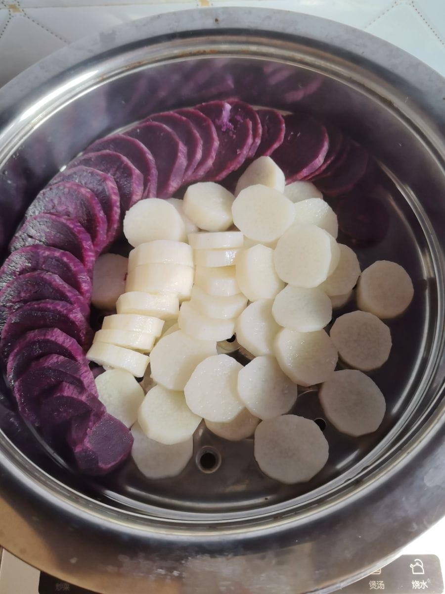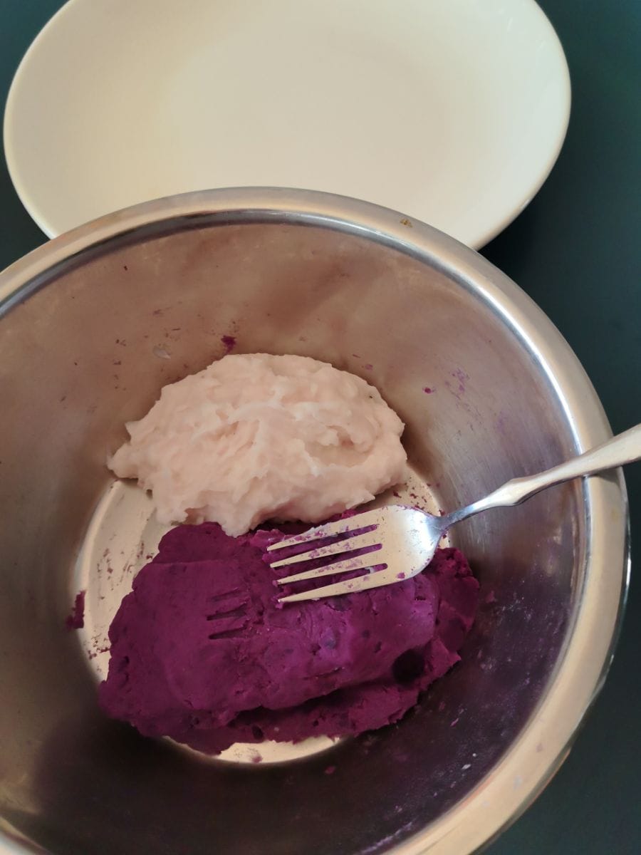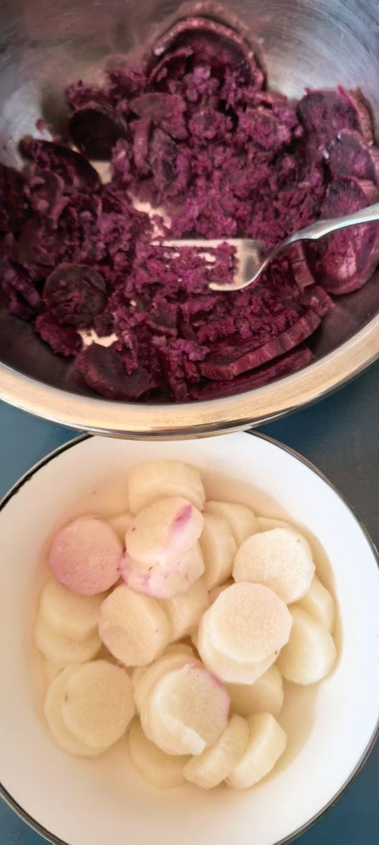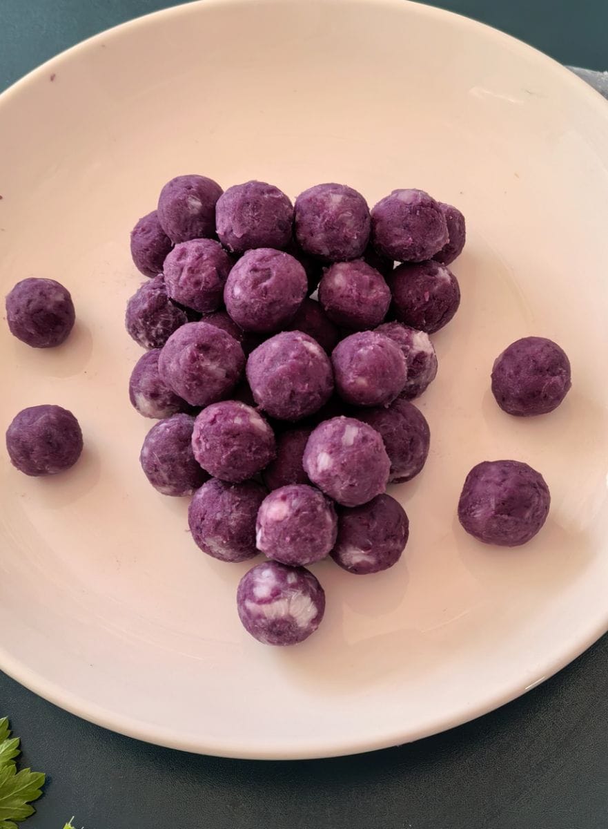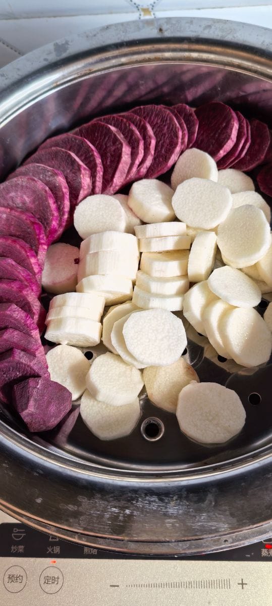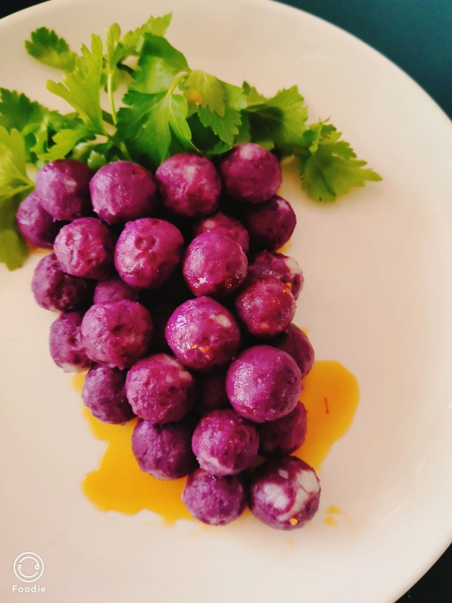 이 요리, "동쪽에서 오는 길한 자색 기운"은 자색 고구마와 마를 경단처럼 빚어 만듭니다. 자색 고구마와 포도알 모양으로 만든 디저트라고도 불리며, 설날 전야 만찬에 인기 있는 독창적인 요리입니다. 행운, 가족 상봉, 풍요로운 재물, 달콤하고 행복한 삶을 상징합니다.