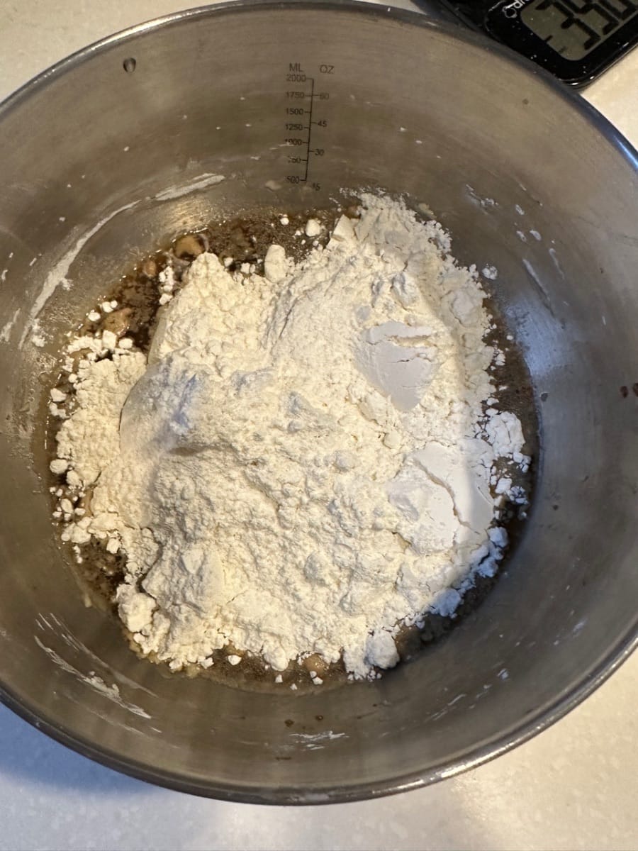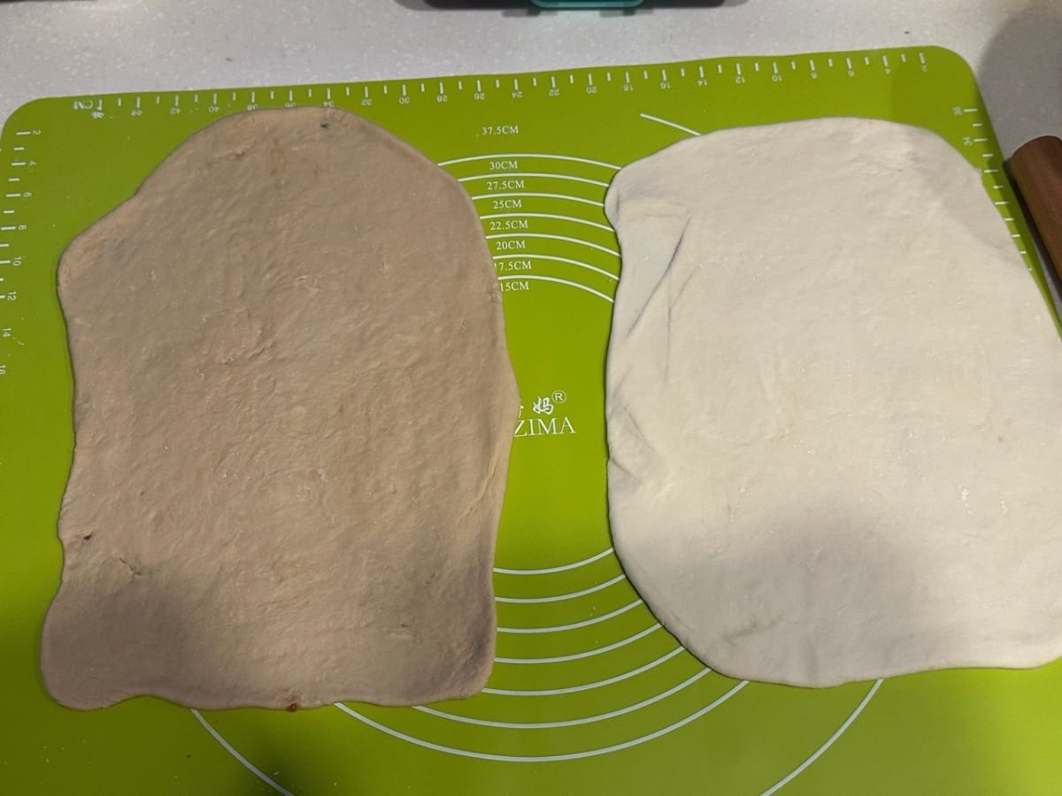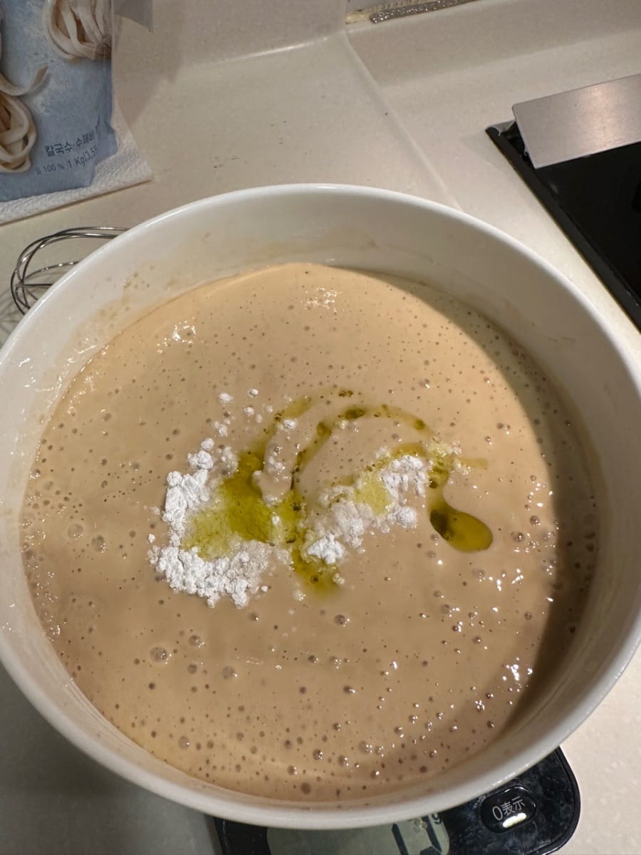 สำหรับการทำแป้งธรรมดา ให้ใส่ยีสต์ น้ำตาล และน้ำก่อน จากนั้นตามด้วยแป้ง นวดจนส่วนผสมเข้ากันดี แป้งไม่จำเป็นต้องเนียนมาก