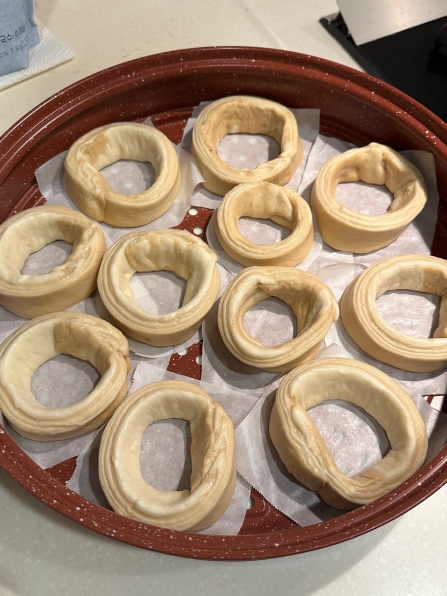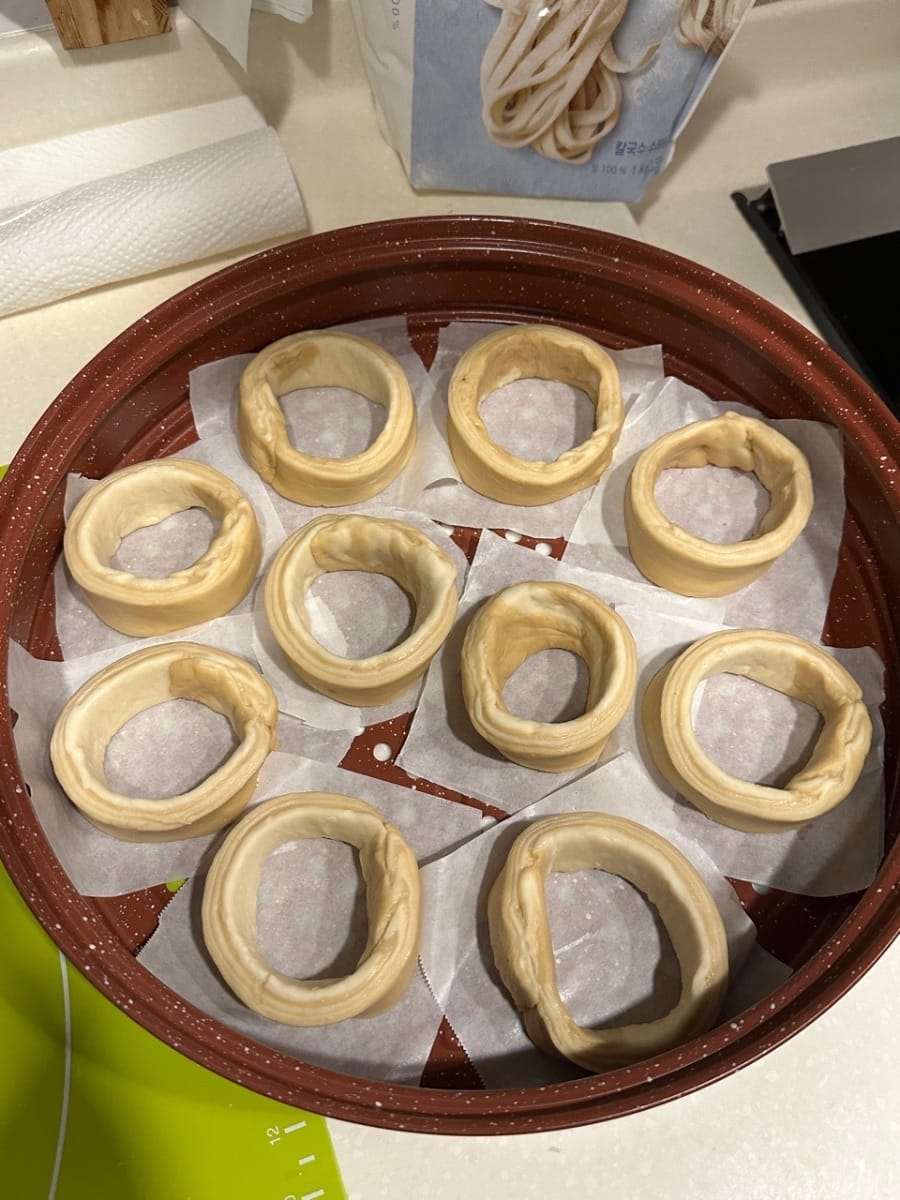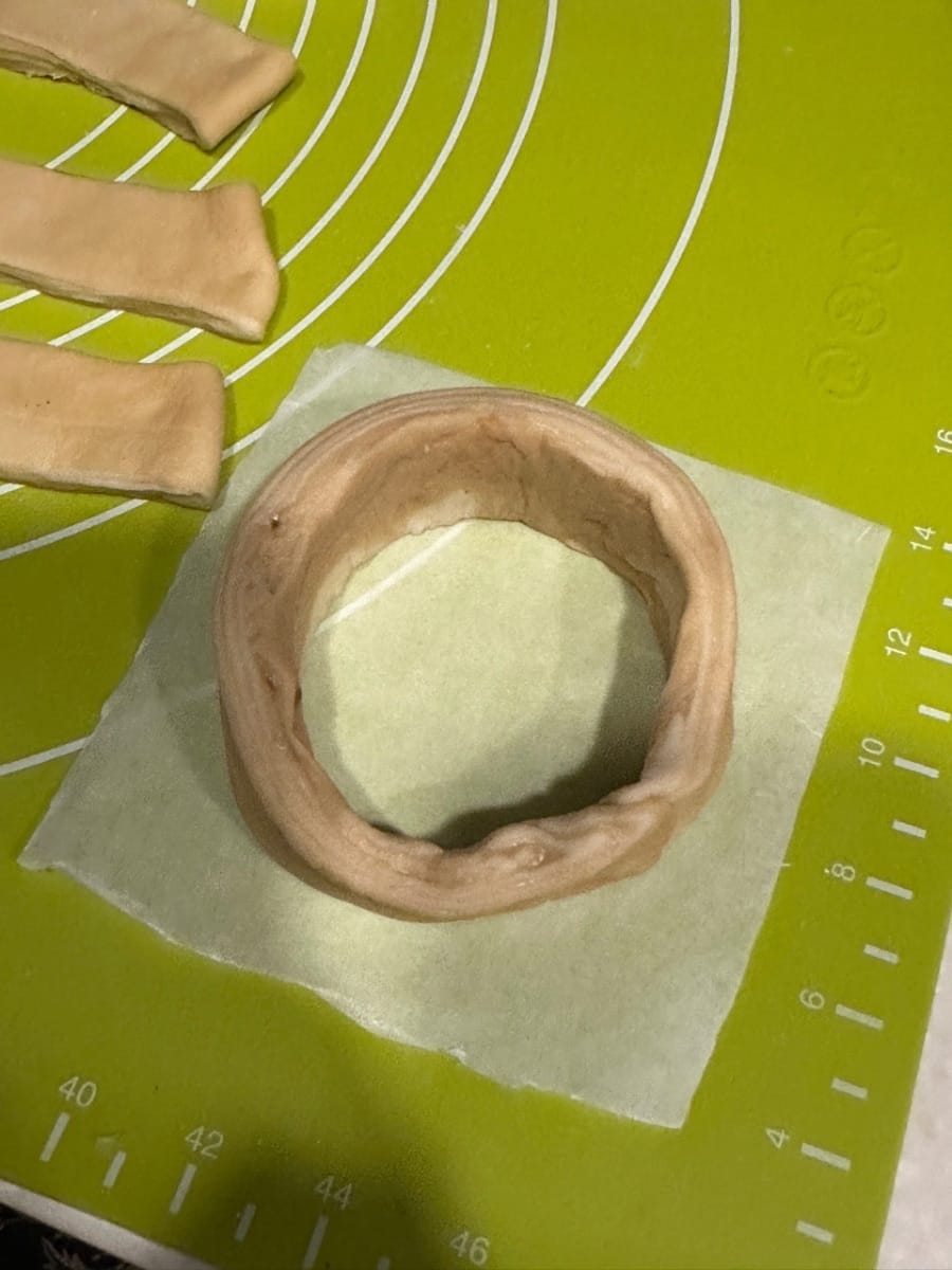 ม้วนแผ่นแป้งให้เป็นรูปวงกลมบนกระดาษไข ตรวจสอบให้แน่ใจว่าด้านที่เรียบและสวยกว่าหันออกด้านนอก เย็บปลายที่เชื่อมต่อกันให้แน่นด้วยน้ำเล็กน้อย