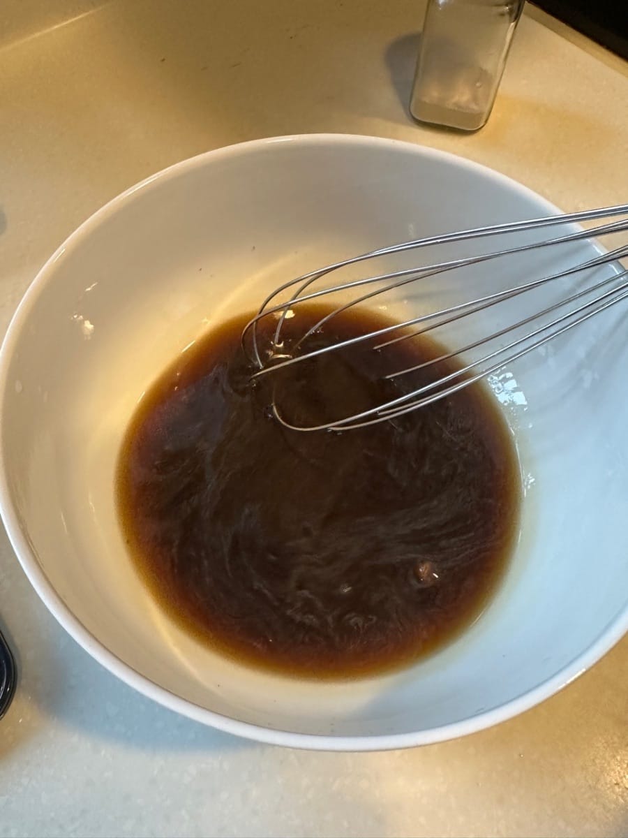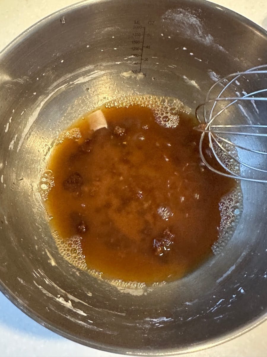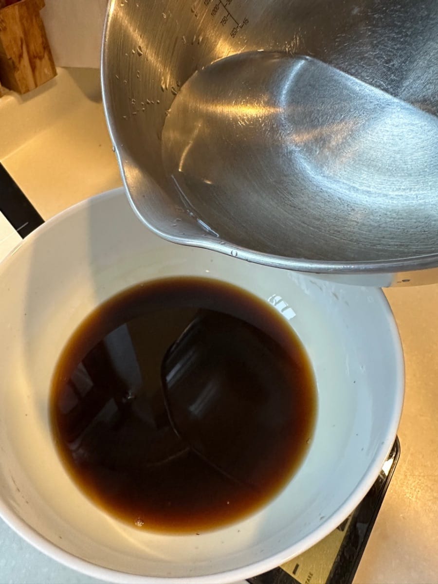 เริ่มต้นด้วยการทำขนมหม่าไล ละลายน้ำตาลทรายแดงในน้ำร้อน จากนั้นเติมน้ำเย็นลงไป