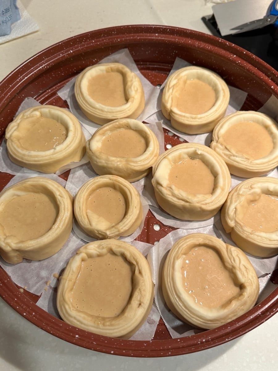 ค่อยๆ เทส่วนผสมขนมหม่าไลลงตรงกลางแป้ง
