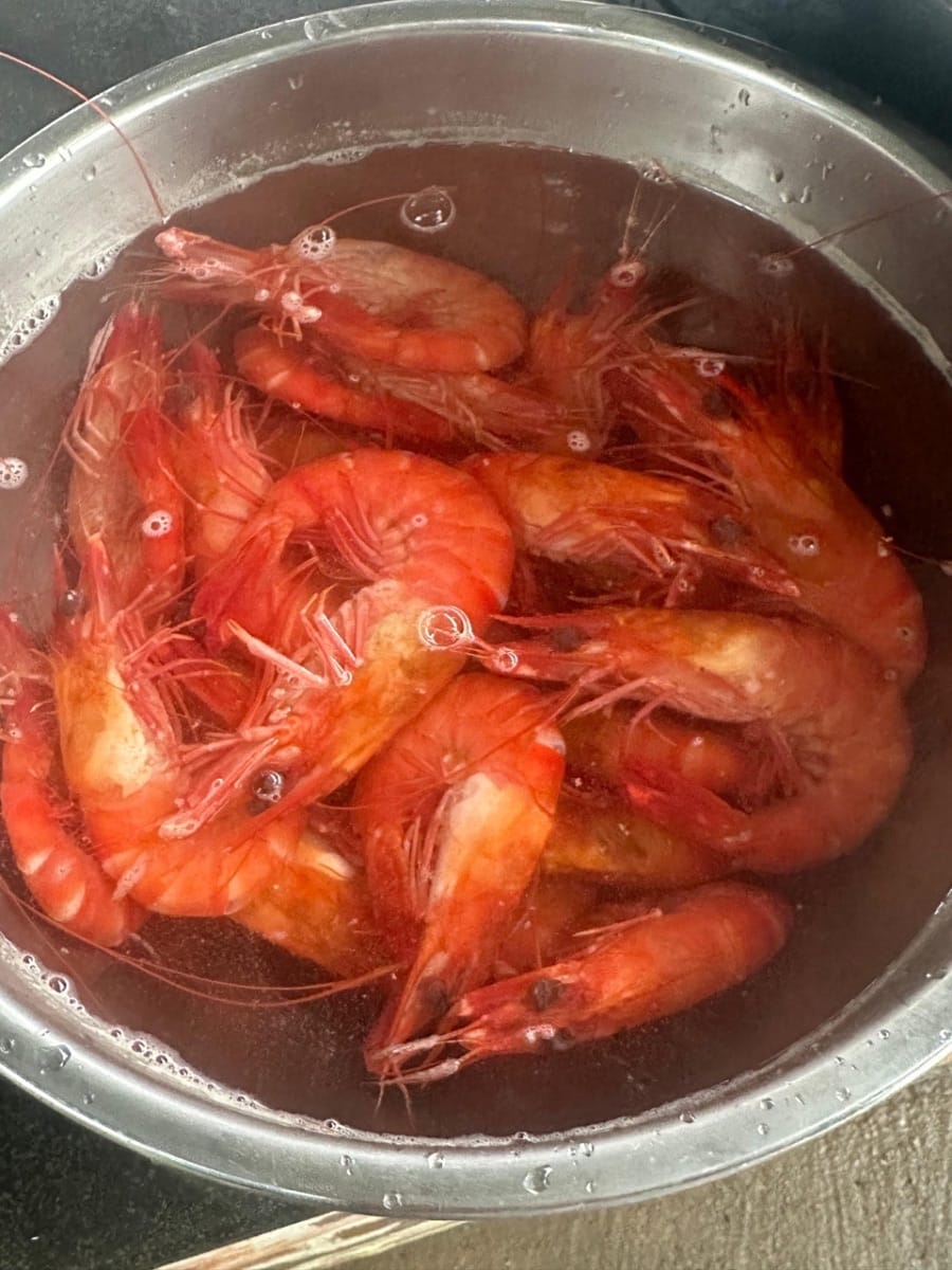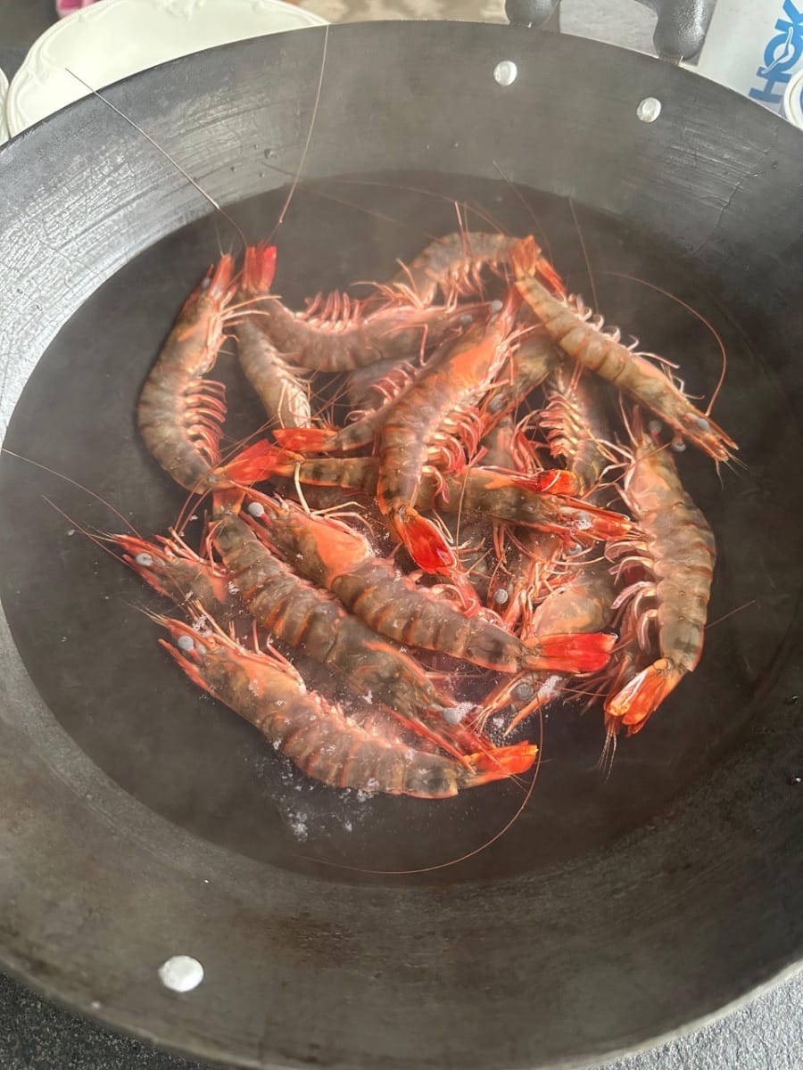 ใส่น้ำเดือดลงในหม้อน้ำเดือด ใส่เหล้าข้าวลงไป แล้วนำกุ้งลงไปต้มประมาณ 3 นาที