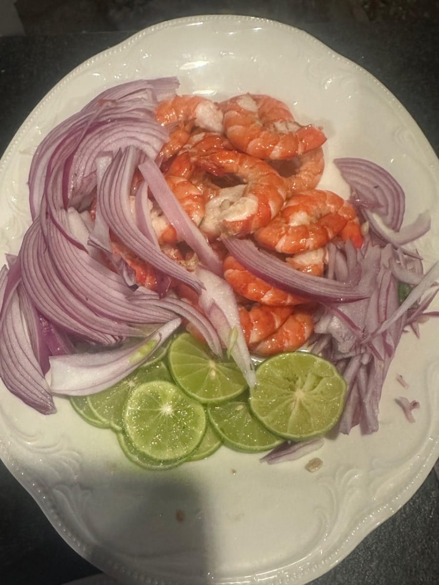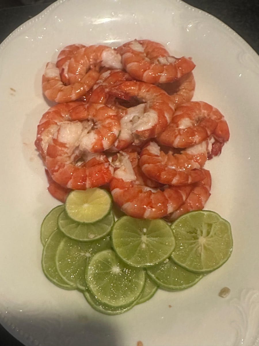 จัดกุ้งปอกเปลือกและมะนาวฝานลงในจานเสิร์ฟ