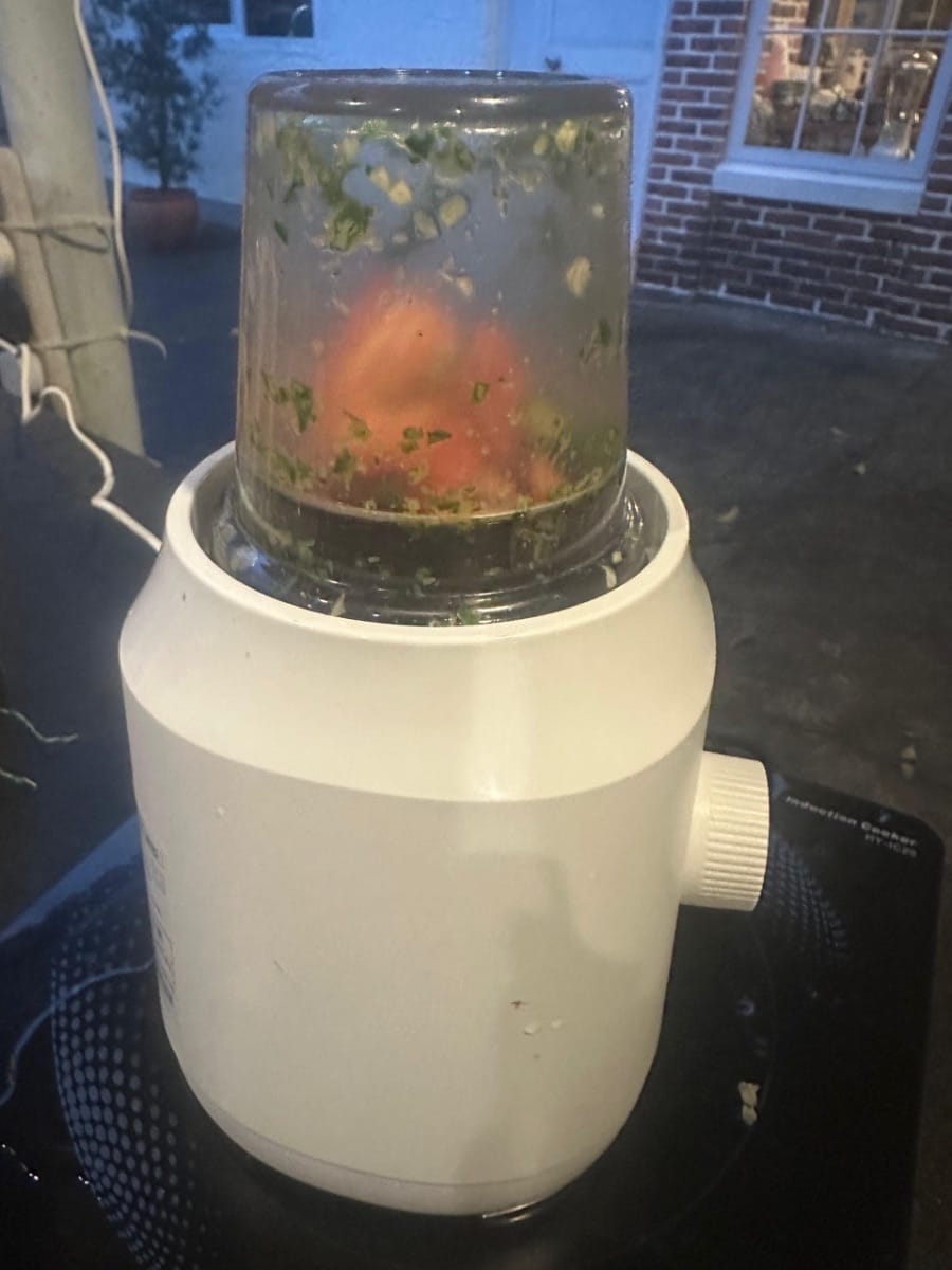 นำส่วนผสมทั้งหมดไปปั่นในเครื่องปั่นพร้อมกับซีอิ๊ว น้ำปลา และน้ำตาล