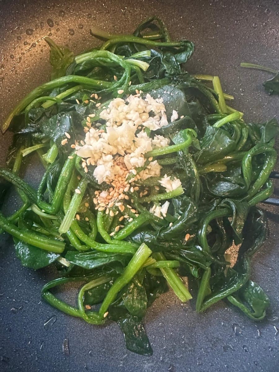 ปรุงรสผักโขมด้วยส่วนผสมที่ระบุไว้ พักไว้ก่อนเพื่อใช้ในภายหลัง
